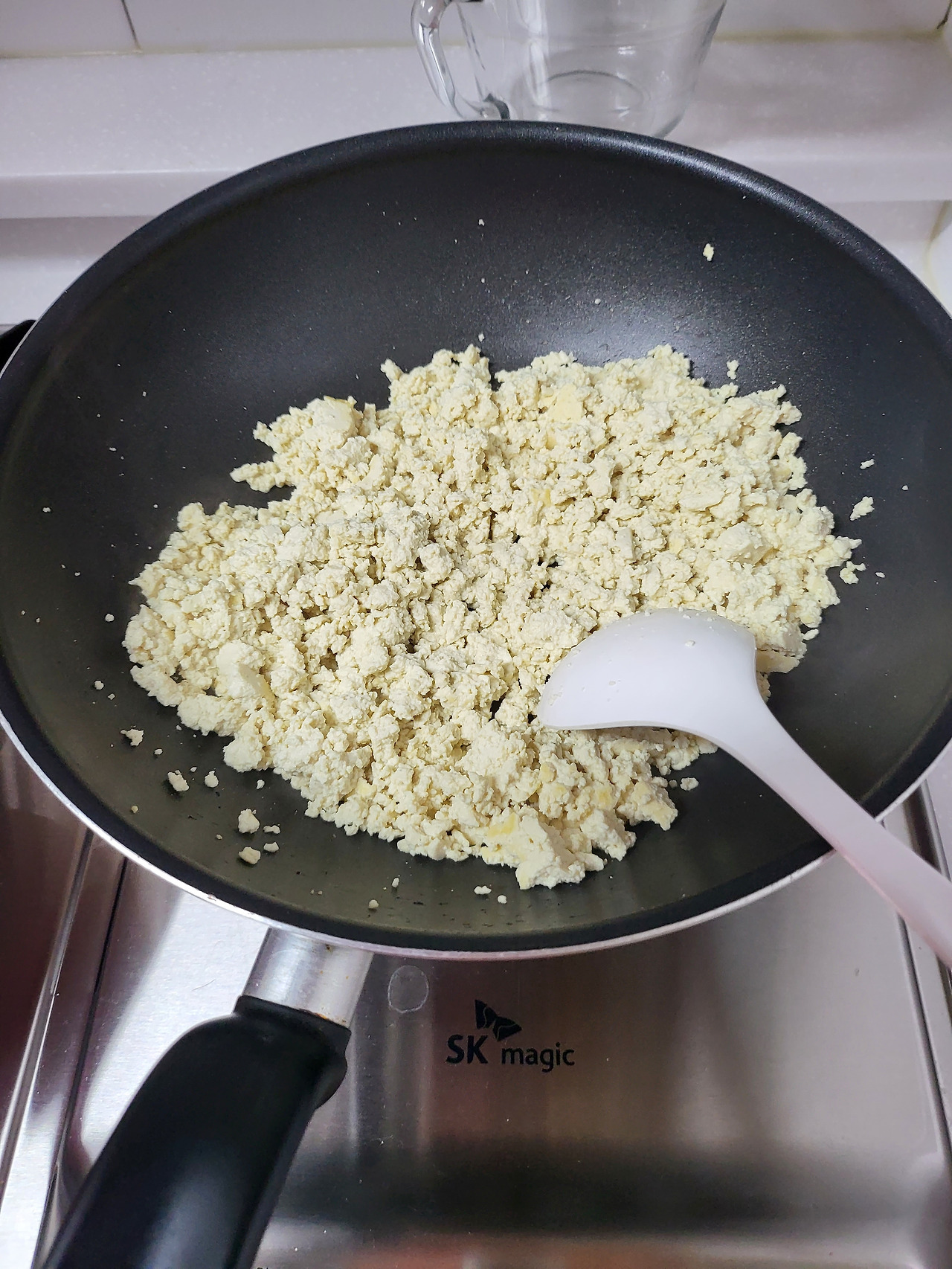 야채전에 으깬 두부를 볶아서 넣으면 영양도 좋고 맛도 일품이다. '야채 으깨기'를 사용하면 쉽게 으깰 수 있다. 볶음팬에 으깬 두부를 볶는다. 볶는 동안에 두부 속에 있던 수분이 날아간다.