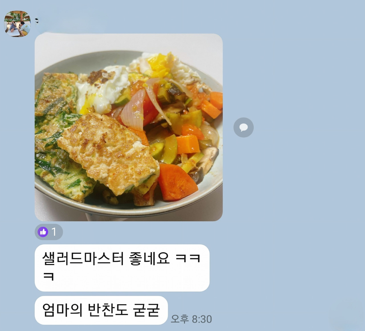 내가 보낸 부침개를 딸내미는'샐러드 마스터'로 하는 요리에 곁들인 모양이었다. 기발한 아이디어다. 요즘 핫한 샐러드 마스터*로 야채찜을 해 먹곤 하던 딸내미는 그 부침개를 토핑으로 얹었다. 청출어람이라고 할까? 금상첨화라고 할까?