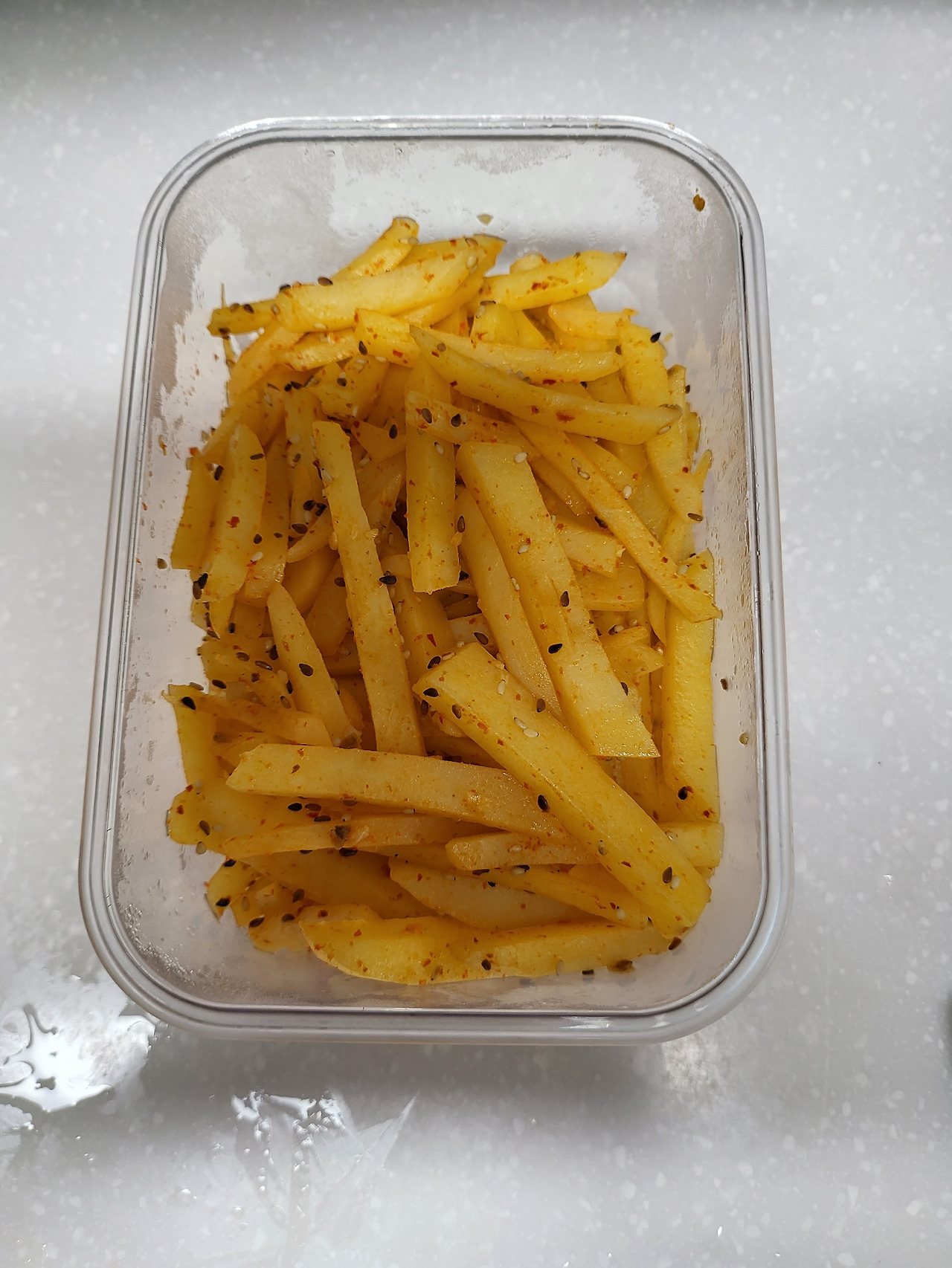 우여곡절 끝에 감자채 볶음 만드는 법을 터득했다. 이제는 어나더 레시피로 감자채 볶음에 변화를 주고 싶었다. 감자채를 볶을 때 다진 마늘과 고춧가루를 약간 넣었다. 좀 더 개운하고 칼칼한 감자채 볶음을 만들어 보고 싶었다. 살살 녹는 맛이었다. 일전에 감자채 볶음을 제대로 하게 된 에피소드를 브런치 글로 발행한 적 있다.