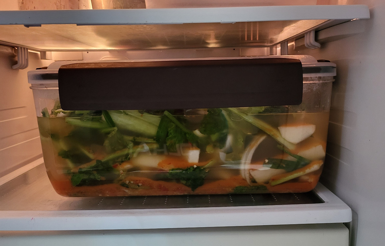 하룻밤을 지나고 김치통 뚜껑을 열어 보니 군침이 돌았다.