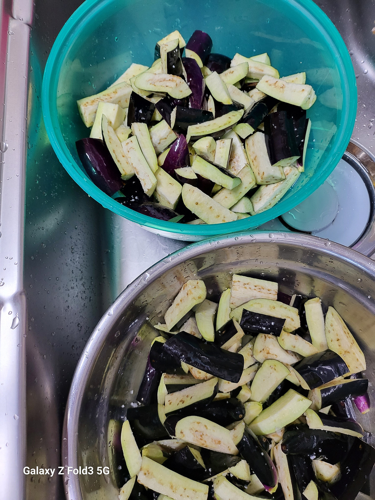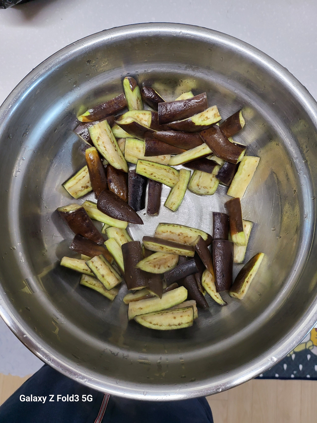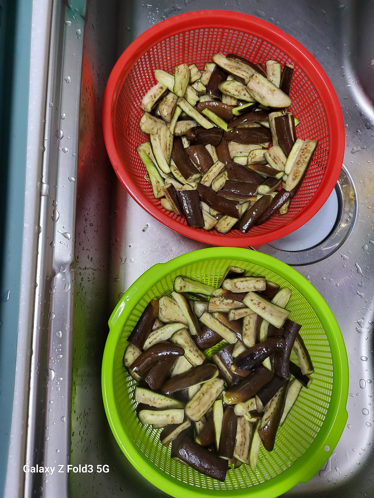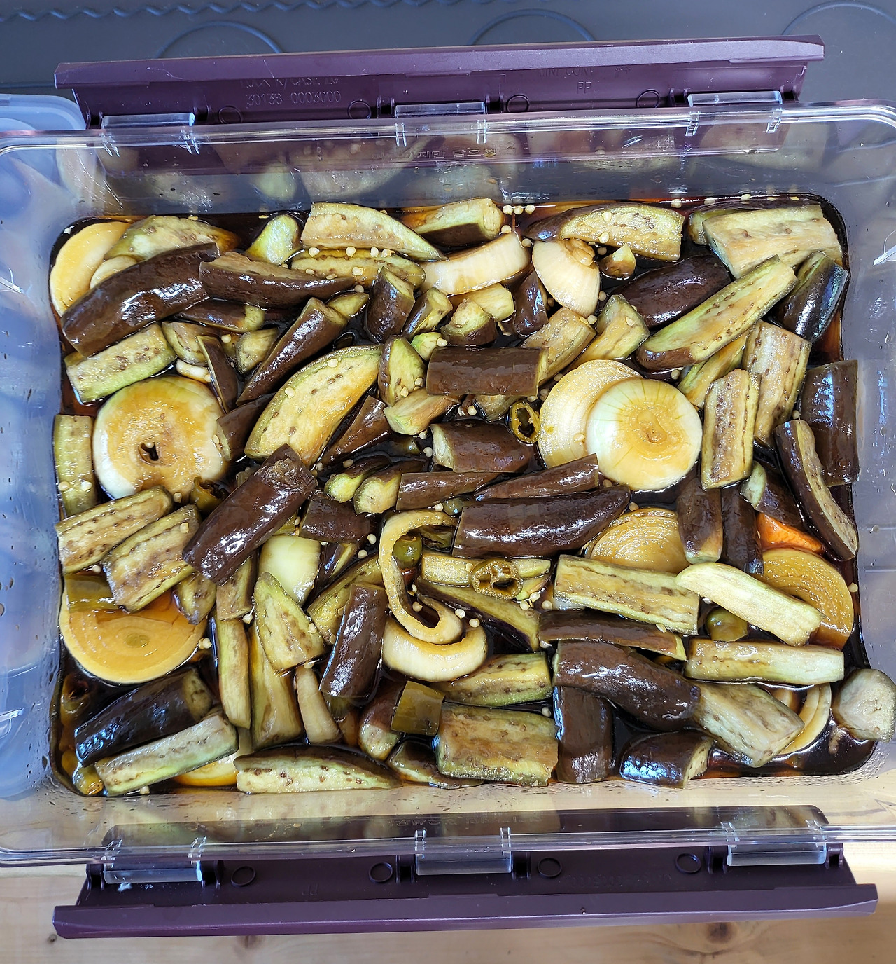 - 마지막으로 물기를 쏙 뺀 가지를 만능 장아찌 간장에 담근다.