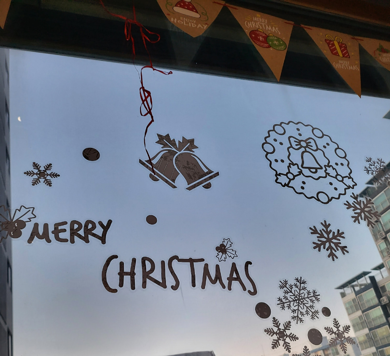 우리는 눈꽃송이, 별꽃송이, 종 모양 스티커와 함께 <Merry Christmas>라는 글씨 스티커를 각자 분량대로 베란다 창문에 붙이기 시작했다. 스티커를 붙이며 이런저런 얘기도 나누었다. 그 시간이 참 오붓했다. 깔깔거리며 웃으니 마치 어린 시절로 돌아간 것처럼 가슴이 설렜다. 그런데 남편은 종 모양 스티커를 거꾸로 붙여놓았다.