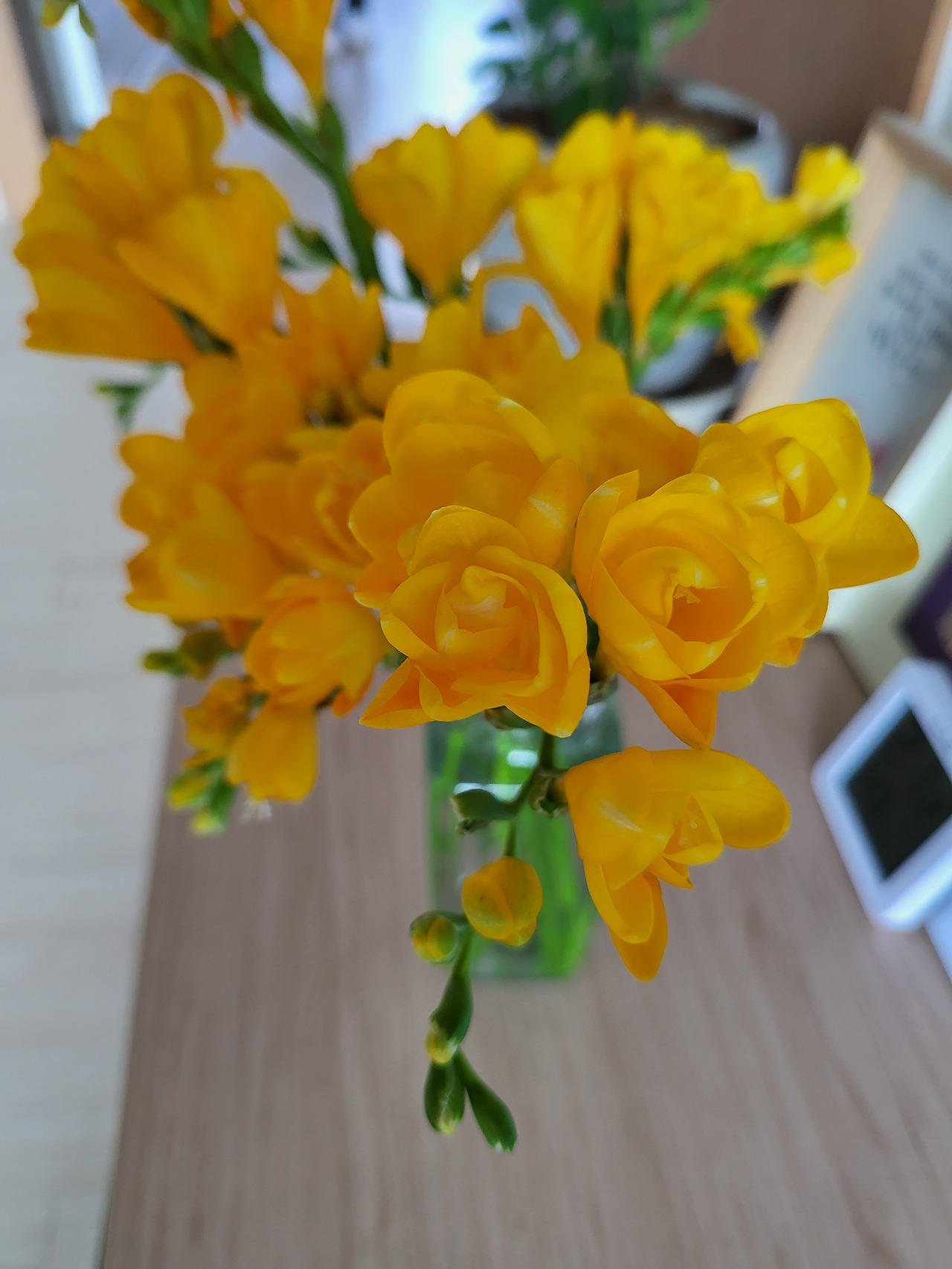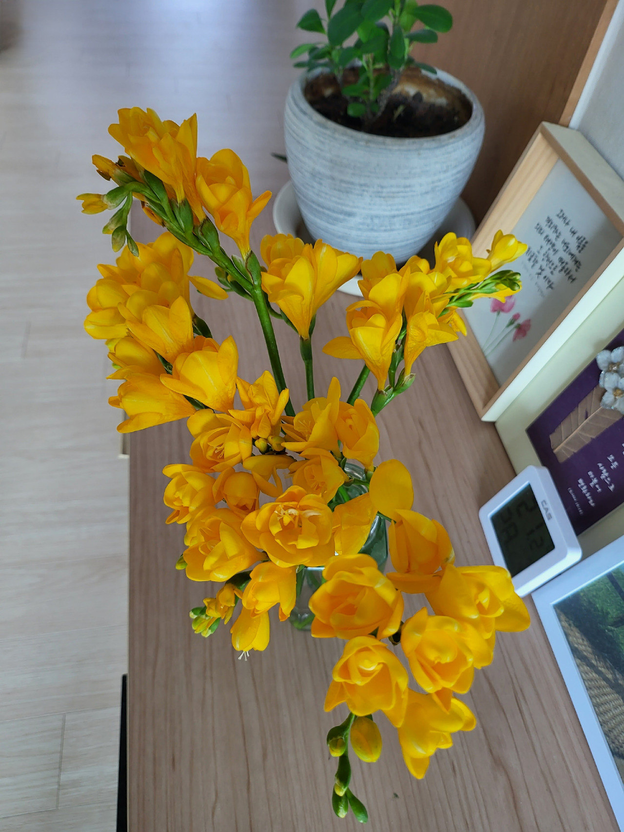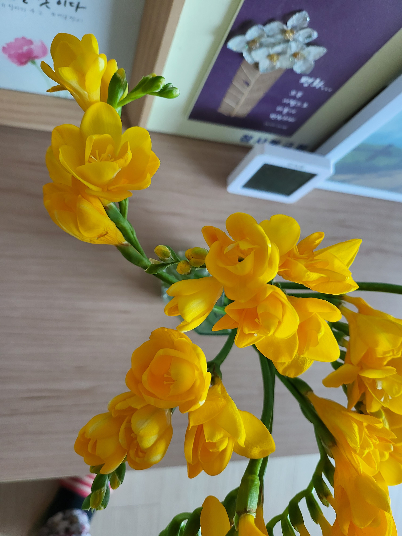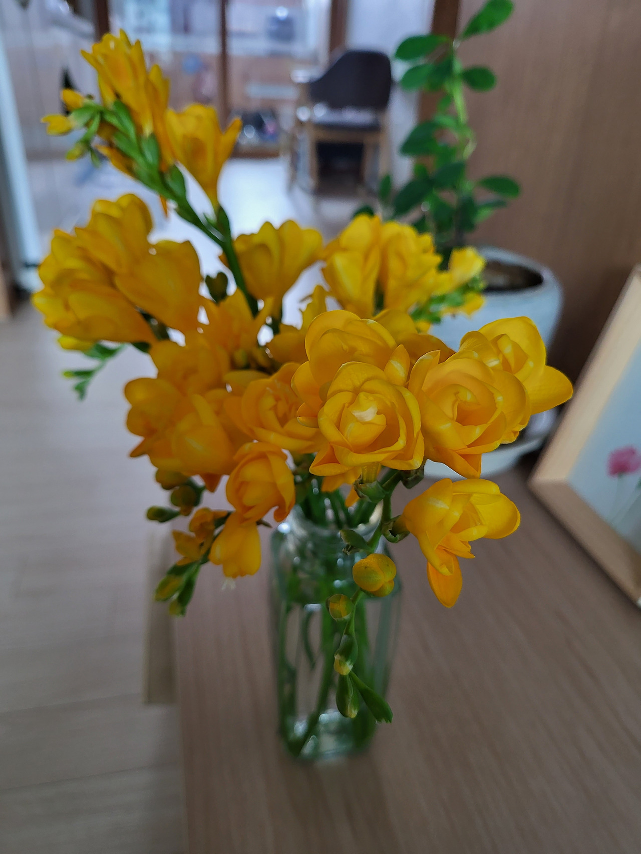 한 낱 몇 송이 프리지어지만, 내가 나에게 선물한 꽃이니 특별하다. 그래서 더없이 정겹게 여겨졌다. 내 프리지어가 내게 소중한 이유는, 내가 이 프리지어에게 바친 시간 때문일 것이다. (<<어린 왕자>> 글에서 패러디 한 문장)