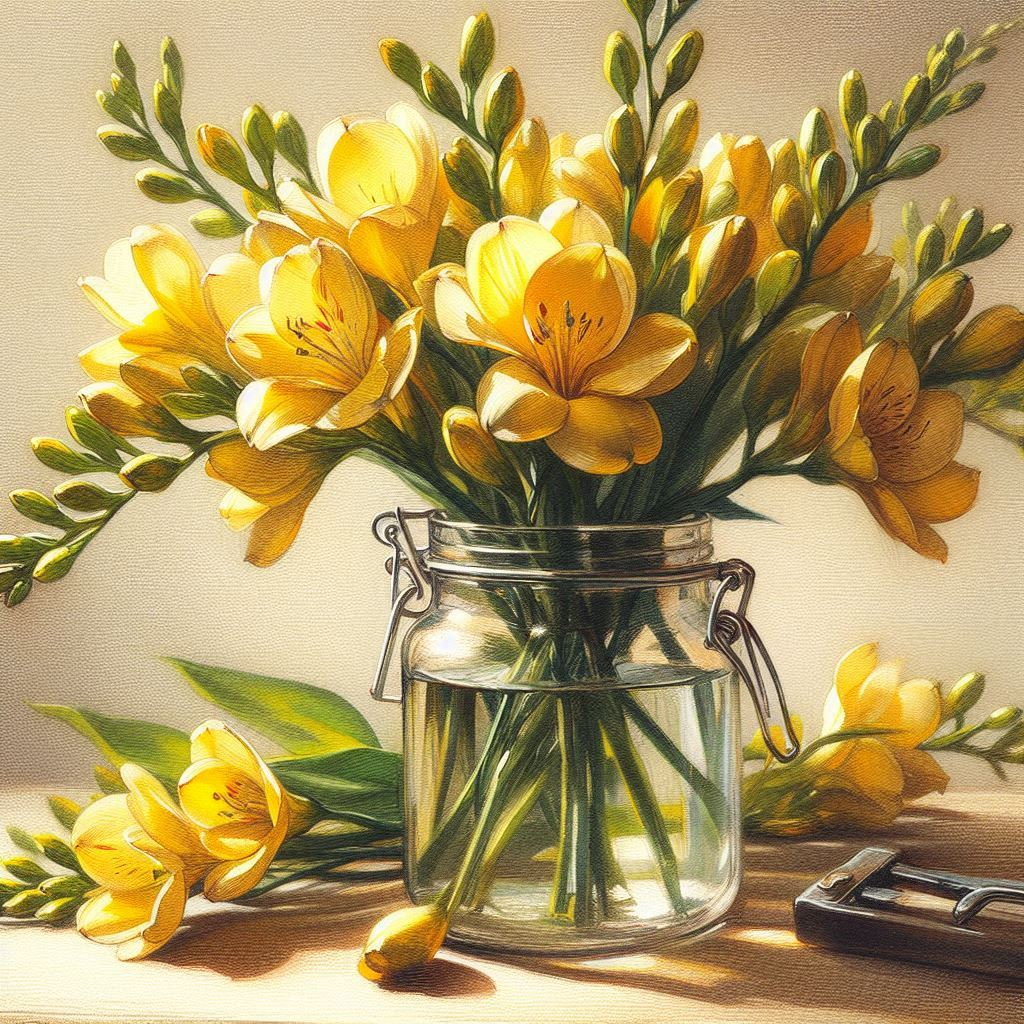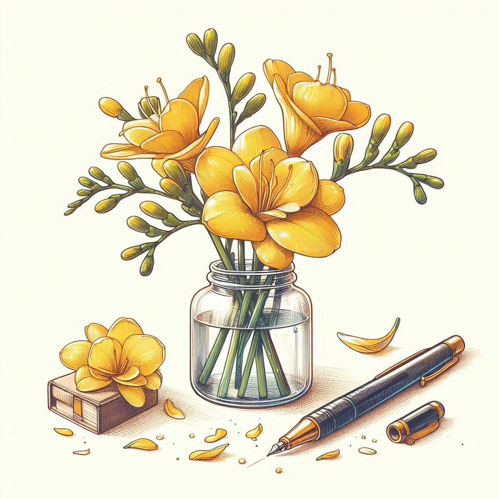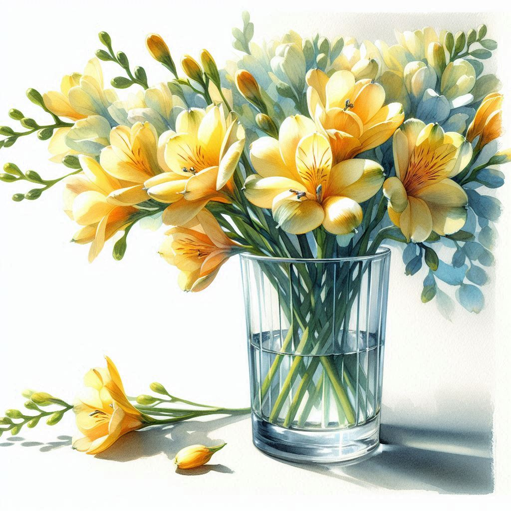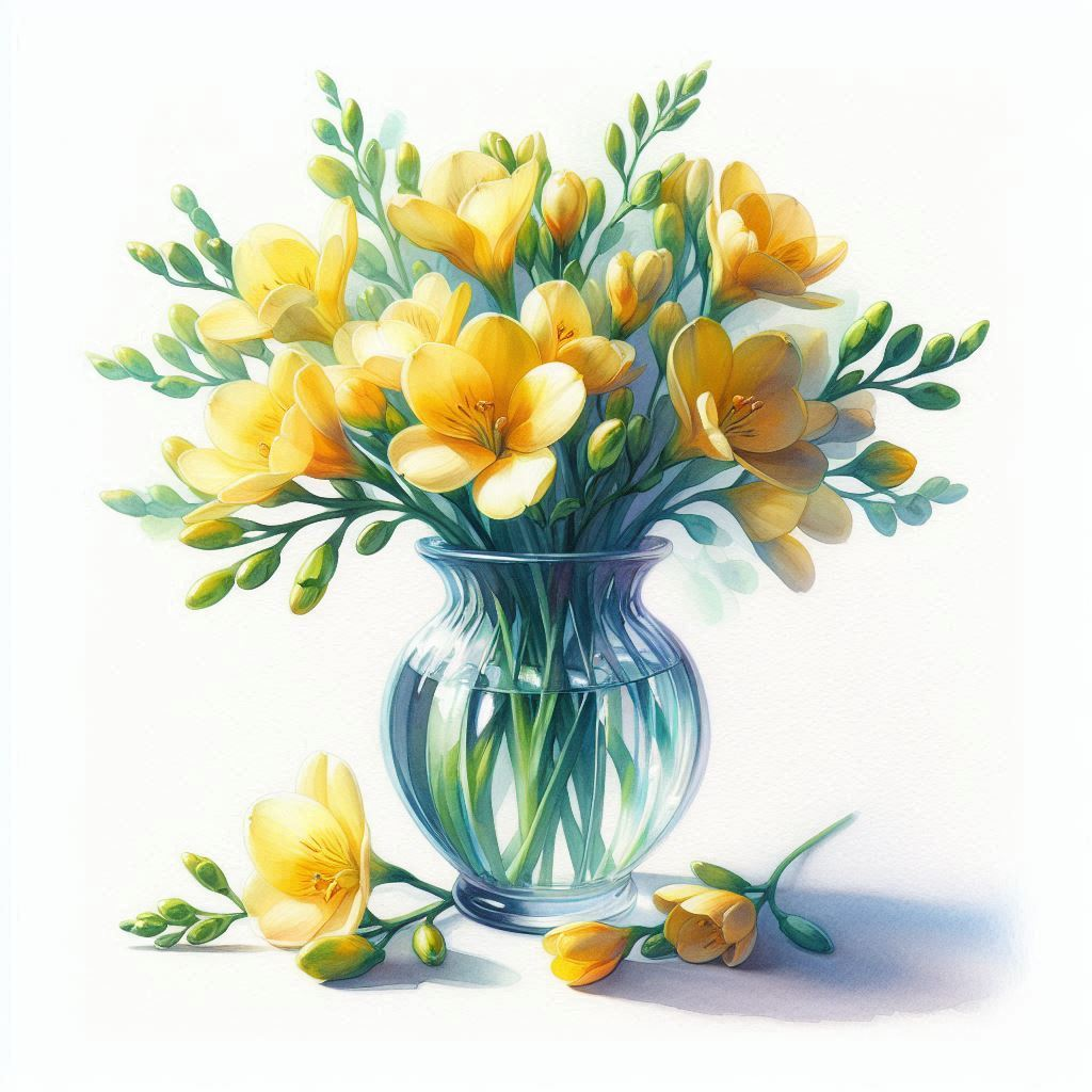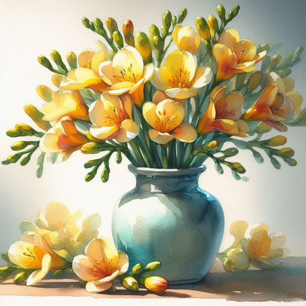 AI : 노란색 프리지어 꽃이 담긴 아름다운 수채화가 곧 준비됩니다! 잠시만 기다려주세요.