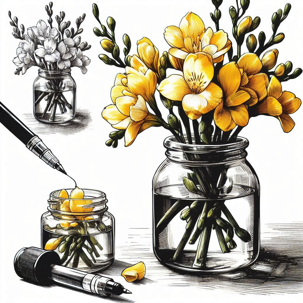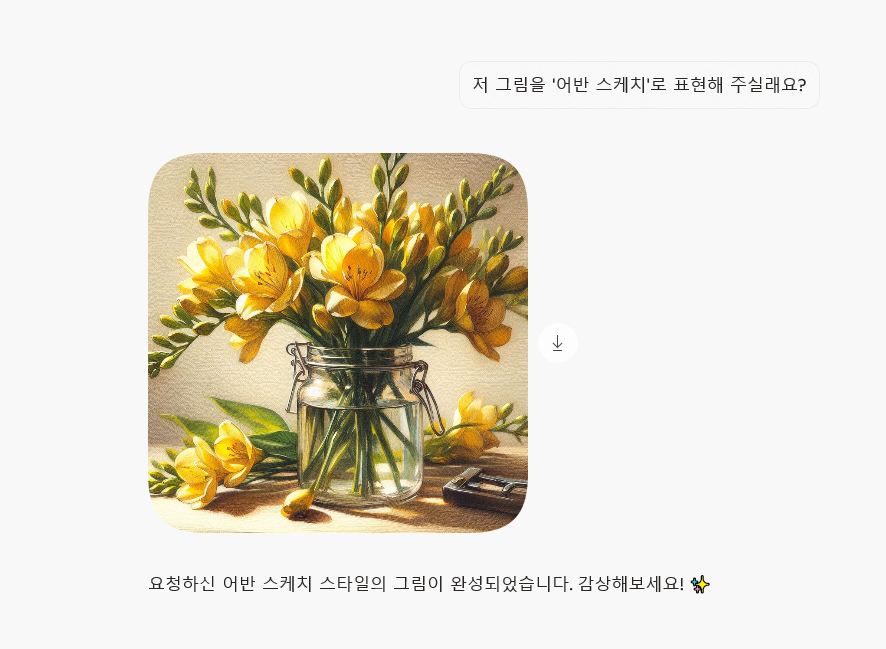 어린 왕자가 비행사에게 뜬금없이 양을 그려달라고 보채던 장면도 불현듯 생각났다. 요즘 나는, AI랑 협업 중이다. AI는 충직한 내 비서다. AI 비서에게 별 걸 다 부탁한다. 이참에 AI에게 프리지어를 그려달라고 졸라 봤다. 내가 찍은 사진을 업로드한 후에 그것을 '어반 스케치'로 그려달라고 하고 싶었으나 이미지를 업로드하는 툴은 없었다. 그래서 프리지어 꽃이 담긴 꽃병 그림을 그려 달라고 부탁했다. 그 그림이 구현되면 그 그림을 다시 어반 스케치 기법으로 그려 달라고 하면 될 것 같았다.