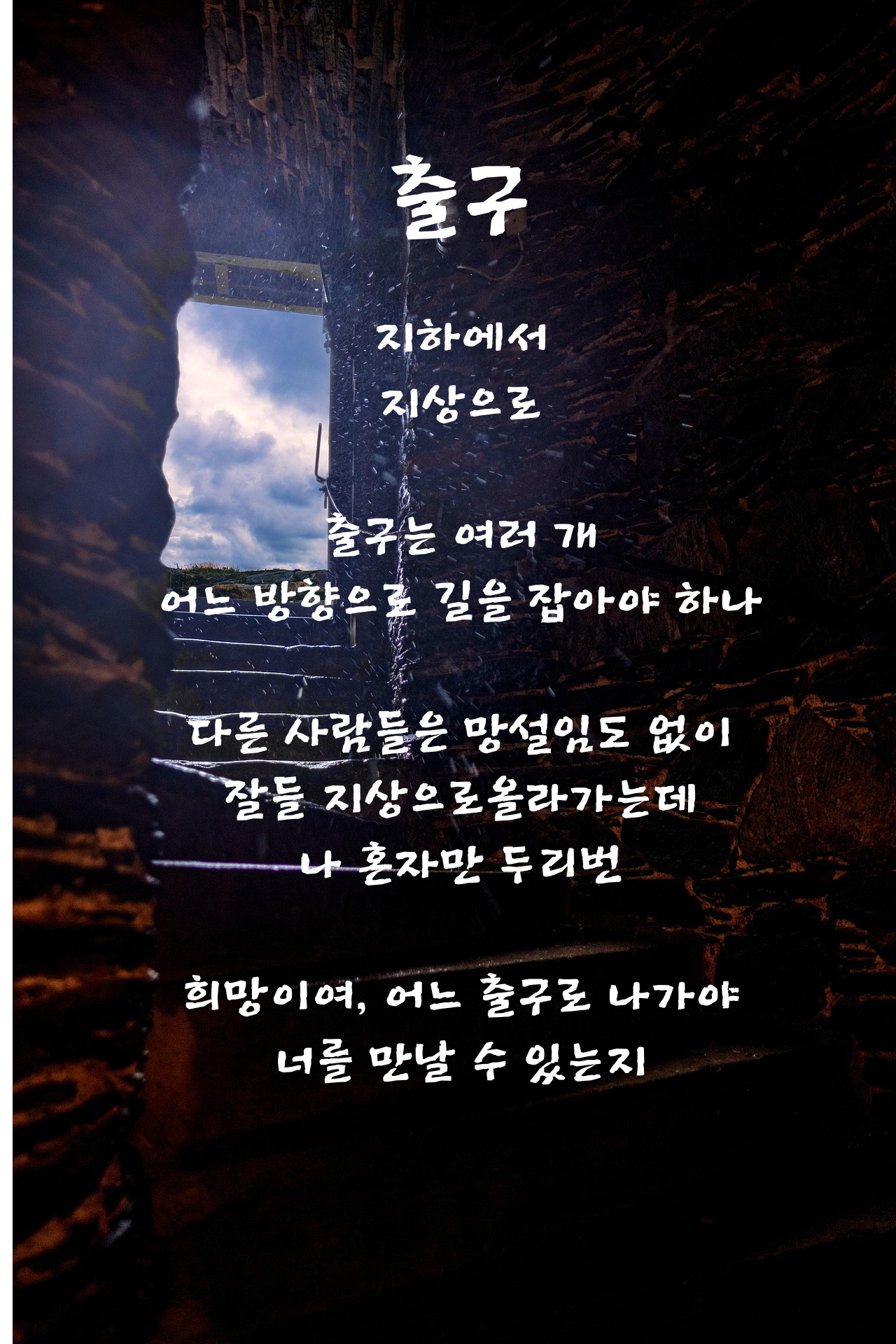 그렇다고 시화 만들기를 포기하고 싶지 않았다 한 번 마음먹으면 끝을 보는 내 성격은 이럴 때도 멈출 줄을 몰랐다. 아이디어가 떠올랐다. '픽사베이'에서 '출구' 이미지를 하나 찜했다. 그 이미지에 시 전문을 입력하기 위해서 AI 아트 생성기 '캔바'라는 앱으로 이동했다. 그렇게 하여 마침내 시화를 완성했다. 대화형 AI가 한 일은 없지만 결국 AI 아트 생성기가 한 몫했다. AI를 힘입어 시화를 만들어 냈다.