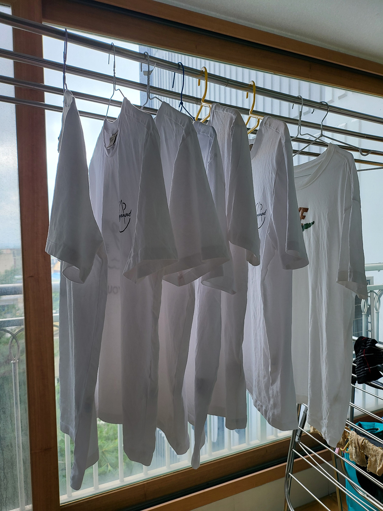 간밤에 다림질해 둔 옷이 거실에 잔뜩 널브러져 있다. 다림질해 뒀던 남편의 7부 여름용 바지 세 벌, 내가 입을 여름 용 면티도 서너 장을 예쁘게 정리했다. 또한 가족티를 구입하여 세탁한 후에 건조기에 말려 다림질했었다. 그걸 간밤에 옷걸이에 걸어 뒀었다.