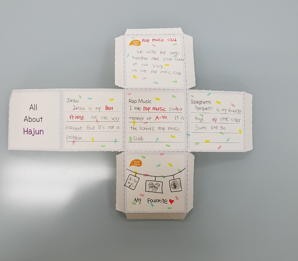 또 다른 활동은, 글을 읽은 후에 본문 내용을 정리해보라고 했다. 짧은 시간에 뚝딱하고 정육면체 겨냥도에 과제를 완성해낸다. 창의성과 과제 수행 능력이 하나의 작품을 창출해낸다. 이런 현장 속에 있는 교사는 행복하지 않을 수 없다.
