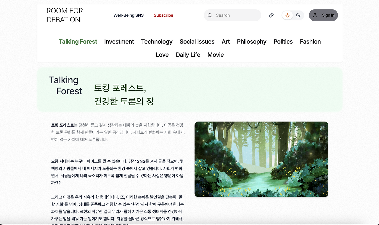 저희는 '숲'을 만들기로 했습니다. 숲은 다양한 생명체가 저마다의 방식으로 공존하며 건강한 생태계를 이룹니다. 토킹 포레스트는 정답을 강요하지 않습니다. 서로의 다름이 공격의 빌미가 아닌, 대화의 출발점이 되는 '지적인 안전지대(Intellectual Safe Zone)'를 꿈꿉니다.
