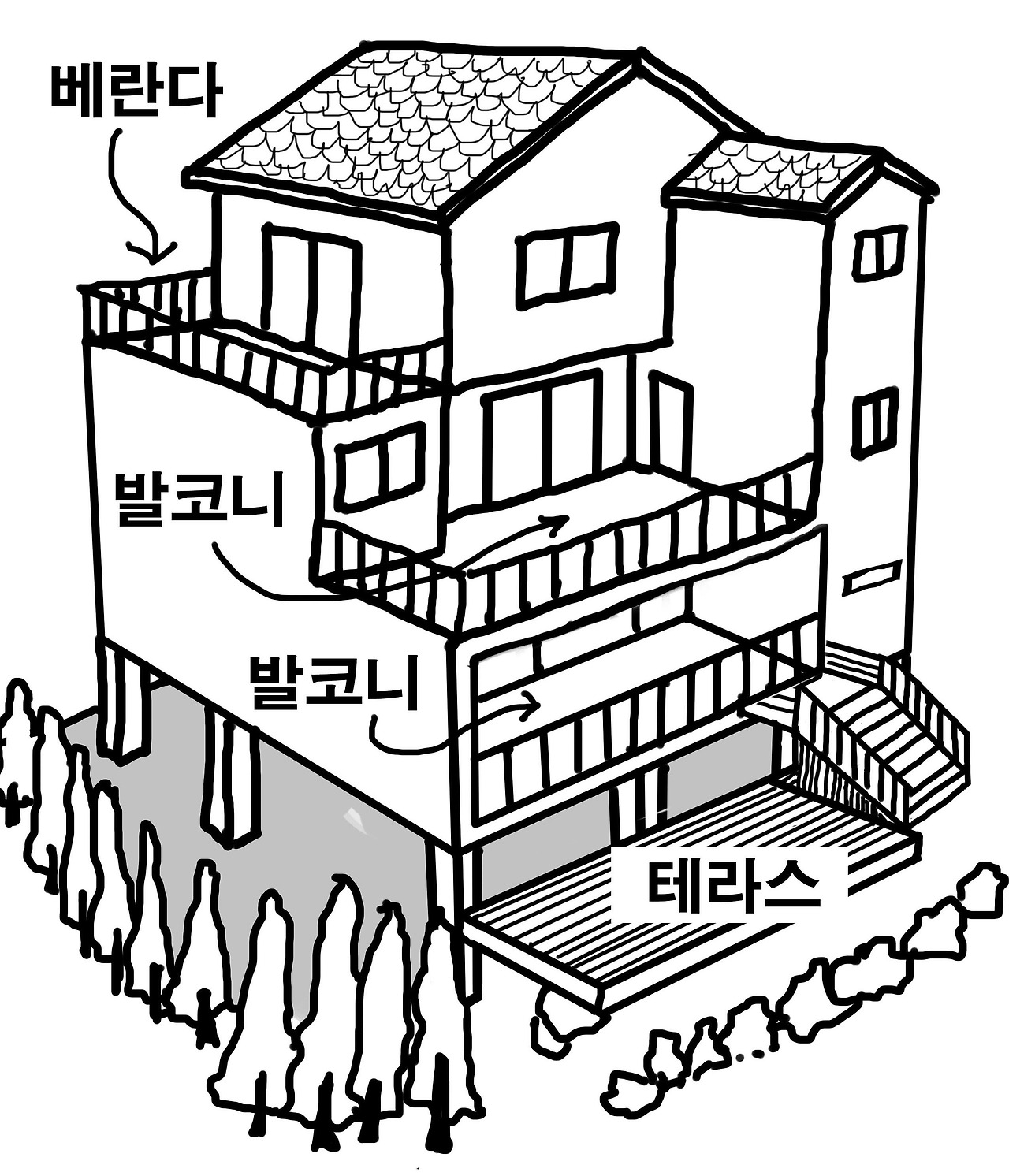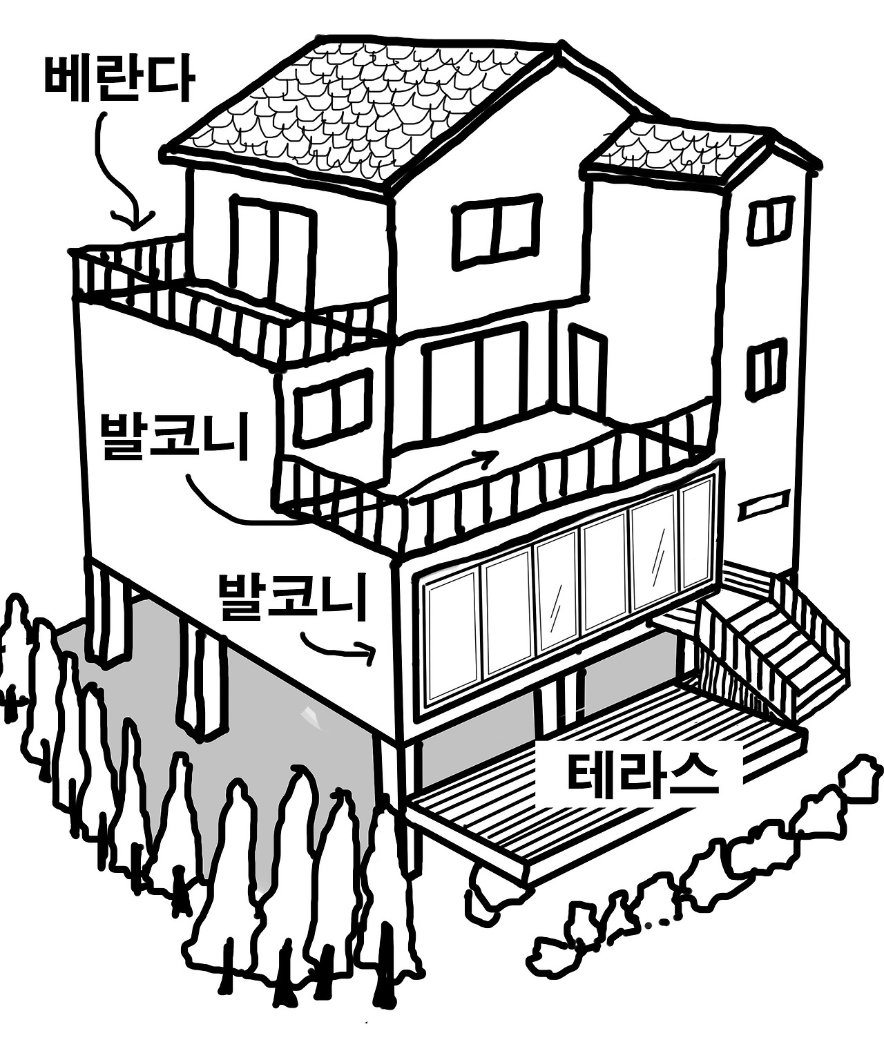 나는 앞서 2층 베란다 3층 베란다 4층 베란다라고 말했다. 아파트에서 베란다라고 일반적으로 부르기 때문에 습관적으로 그렇게 따라 부르고 있지만 정식 명칭으로 하자면 나의 집 1층에는 테라스 2층 3층 공간은 발코니 4층에 만든 공간이 베란다이다. 그림에서처럼 건축물의 외벽으로부터 튀어나온 실내외 완충공간은 발코니이다. 1.5m 이내에서 만들 수 있는 서비스 공간이다. 따라서 실제 분양 면적에 포함되지 않는다. 거실 공간을 연장하기 위해 돌출시켜 만든 공간이다. 먼저, 발코니의 어원은 라틴어 "balcone"로 "큰 창문"이라는 뜻이다. 건축법에서 정의하고 있는 용어로는 건축물의 내부와 외부를 연결하는 완충공간으로서 전망이나 휴식등을 목적으로 건축물 외벽에 접하여 부가적으로 설치되는 공간. 보통 우리나라 아파트의 경우 바닥과 천장이 있기 때문에 필요에 따라 보일러를 깔고 두꺼운 창호를 설치하여 거실 공간을 넓히는 확장 공사를 하는 경우가 많은데 합법이다.