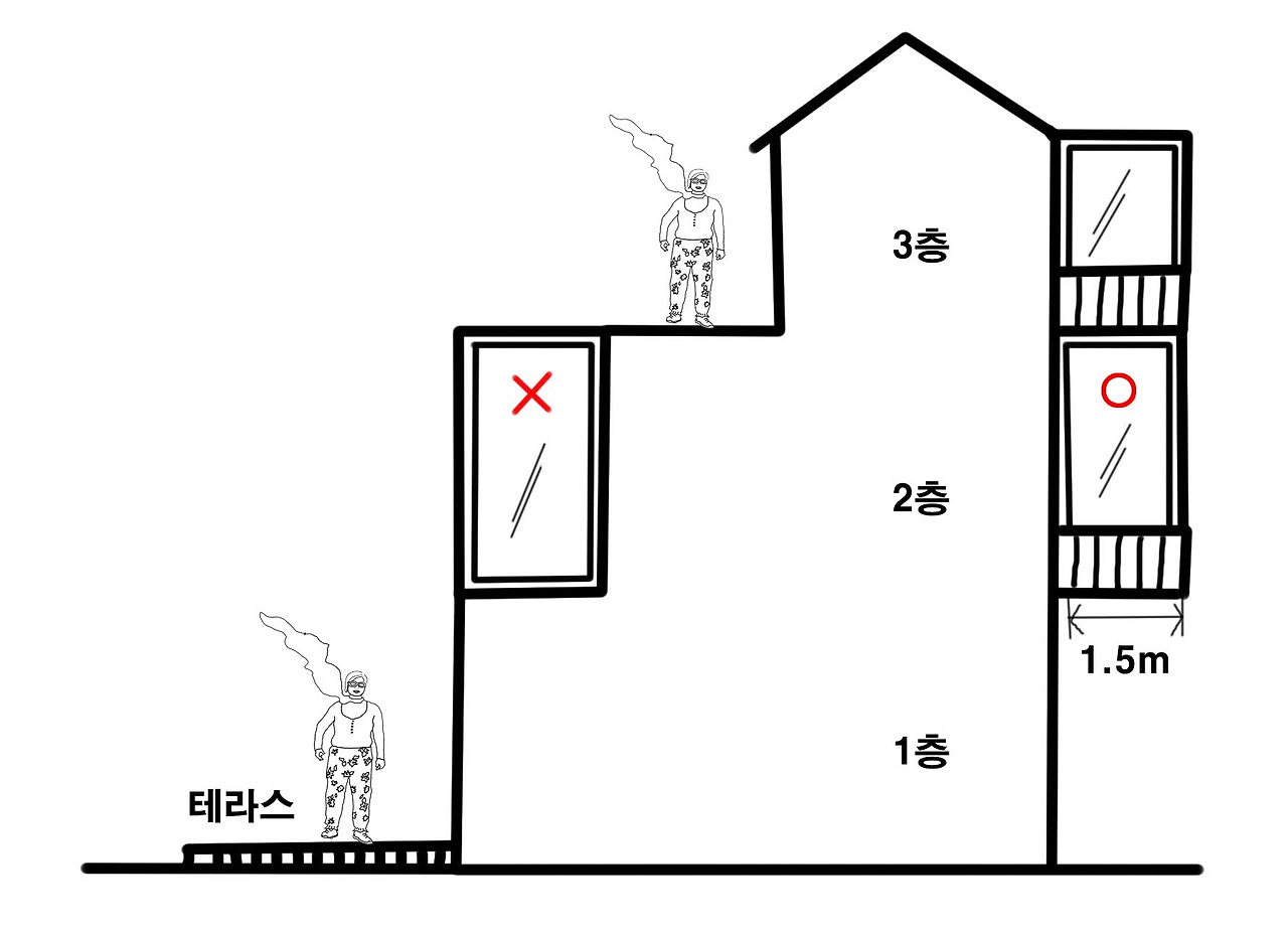 그림처럼 발코니에 창호를 달고 실내 공간 연장하는 것은 합법, 왼쪽의 베란다 공간에 지붕을 만들고 창호를 달아 사용하는 것은 불법이다. 발코니에는 위층 발코니의 바닥 부분이 자연적으로 아래층의 지붕이 되는데 베란다의 경우에는 없는 지붕을 새로 만들어야 한다. 베란다 공간이 1.5m 이내의 좁은 면적이라고 해도 불법 확장이 된다. 나의 집은 2층 발코니에 그 어원처럼 ‘큰 창‘을 달아 실내처럼 사용하고 있다. 데크를 깔아서 난방은 안 되고 이 공간에 화목난로를 두어 사용하고 있다. 3층 발코니는 야외 공간 그대로 빨래 너는 공간으로 사용하고 있다. 1층 테라스는 데크를 깔아서 테이블과 의자를 두고 바비큐를 하거나 생선구이 전이나 튀김 종류 냄새가 많이 나는 음식을 만들어 먹을 때 주로 사용한다.