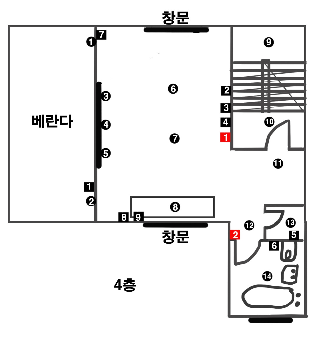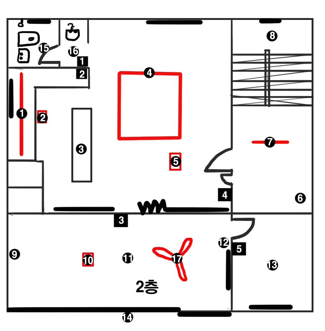 네모 1은 외부 콘센트가 있다. 외부에 있는 콘센트이기 때문에 비가 들어가지 않도록 뚜껑이 있는 제품으로 달아야 한다. 2,3,4번은 4구 콘센트, 인터넷선 콘센트, TV 콘센트이다. 4구 콘센트를 한 곳에 둘 것이 아니라 2구 콘센트를 두 곳으로 나누었더라면 좋았겠다 싶어 아쉬운 부분이다. 창문 옆으로 침대를 두었는데 침대 머리맡에 스탠드와 핸드폰 충전기를 두게 되어서 멀티탭을 사용하고 있다. 5번은 다용도실의 콘센트. 다용도실에 세탁기를 넣을 수 있게 수전도 설치해 놓았고 콘센트도 만들었다. 모든 공간에 2구 콘센트 하나씩은 넣어야겠다는 생각이 든다. 미처 생각 못한 곳에서 가전제품을 꽂아야 하는 경우가 왕왕 발생한다. 6번은 드라이기를 위한 콘센트. 7번은 에어컨을 위한 콘센트였는데 이사하면서 에어컨 위치를 바꾸게 되어 용도가 애매해지고 지금은 사용하지 않는다. 8, 9번은 무선청소기와 커피포트를 위한 콘센트. 빨간색 네모 1번은 전기 스위치의 자리를 표시한 것이다. 대부분 현관문을 열고 들어서면서 오른쪽 벽으로 손을 뻗어 스위치를 켜기 때문에 이곳에 두었다. 여기에서 1~8번까지의 조명을 껴고 끈다. 1번 위치에 보일러 조작패널과 현관 비디오폰도 있다. 2번 스위치로는 욕실 다용도실 조명을 제어한다.