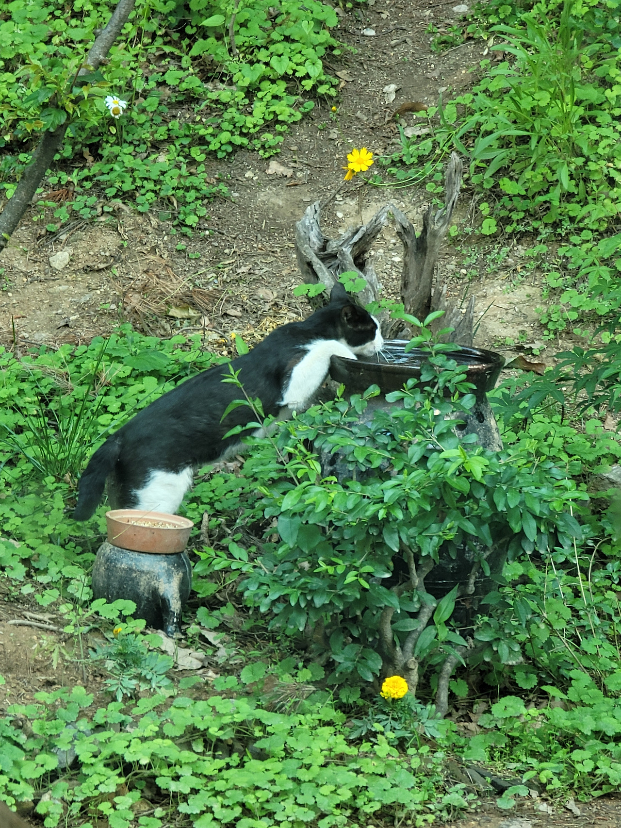 목 마른 들고양이와 텃새들을 위해 매일 아침 항아리 뚜껑에 새 물을 떠 둠
