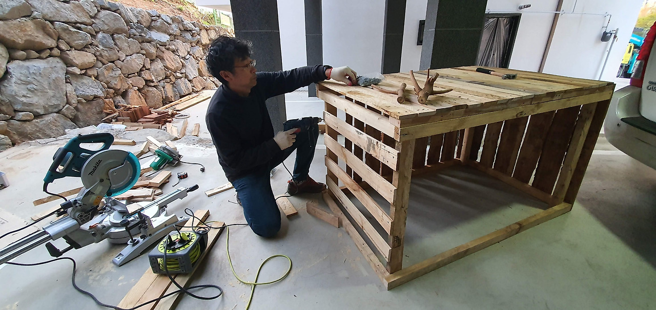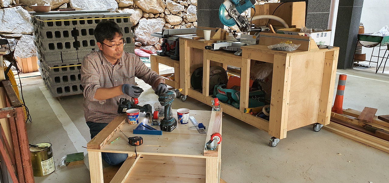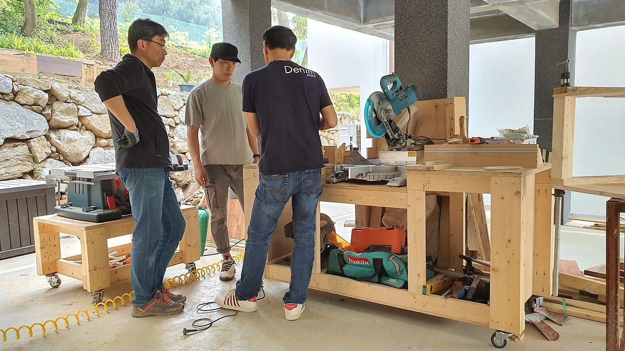 주차장의 일부는 목공을 위한 공방 등 창고로도 이용 가능하다. 목공 작업은 나무가 비에 맞지 않아야 하므로 지붕이 있어야 하고 톱밥이 많이 날리기 때문에 바람이 잘 통하는 곳이어야 한다. 1층 필로티 주차장이 목공 작업에는 안성맞춤인 공간이 되어 주었다.