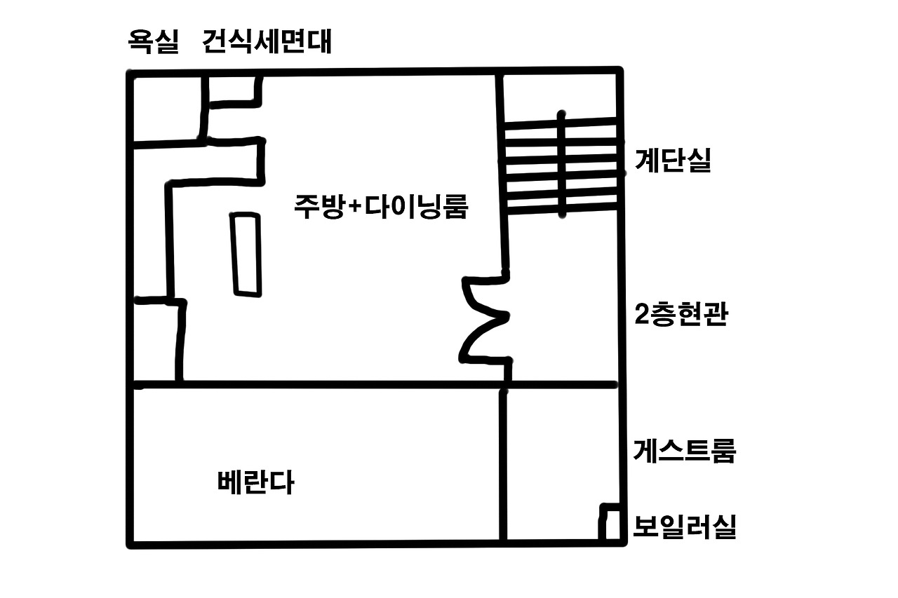 일단 1층. 앞서 이야기한 대로 나의 집은 대지의 남서쪽으로 얕은 산이 있다. 집터에 1m 정도 경사가 있어서 그 부분을 흙을 퍼 내고 석축을 쌓아 경사를 막고 나면 1층이 좀 어두워지는 상황. 별 고민 없이 1층은 필로티 주차장으로 설계했다. 1층을 필로티 주차장으로 만들어야겠다는 생각은 오랜 고민을 하지 않았었는데 집이 완성되고 나서 이사 들어와 살다 보니