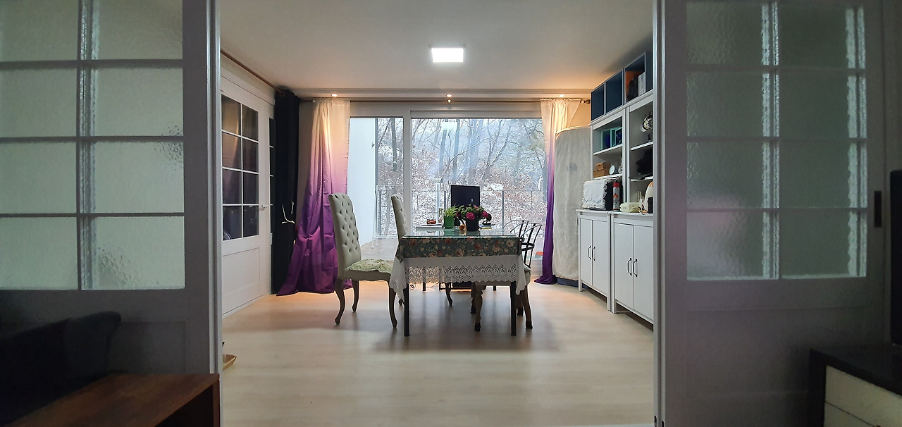 우리 집의 마지막 층인 4층이다. 4층은 아들이 혼자 사용하는 공간이라 공간을 벽으로 막지 않은 원룸 형태로 디자인했다. 4층 문을 열고 들어가면 보일러실 겸 창고가 있고 큰 창이 있는 욕실이 있다. 4층 욕실은 외부 조망이 좋아서 욕조에 누우면 바깥 공간이 충분히 보이게 큰 창을 넣었다. 창고와 욕실 이외 나머지 공간은 벽체 없이 그대로 통째로 두었다. 아들 녀석이 자기 방 청소를 제 때에 할 것 같지도 않고 해서 로봇 청소기 돌리기 좋게 원룸으로 만들었다. 침실 드레스룸 구분 없이 한 공간에 두고 책장을 두거나 커튼을 내려 공간 구분을 했다. 친구가 놀러 오면 함께 잘 수 있도록 싱글 침대 두 개를 넣었다. 2, 3층보다는 작지만 서쪽으로 베란다도 만들었다. 4층 베란다는 해질 무렵에 우리 집의 노을맛집 역할을 하고 있다.