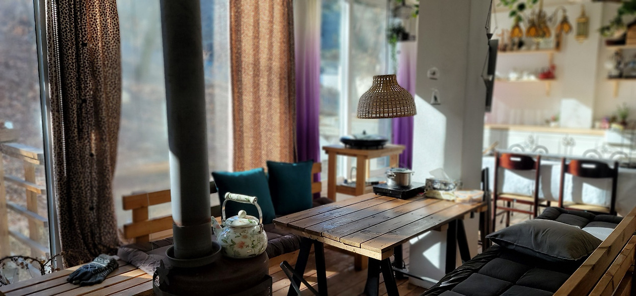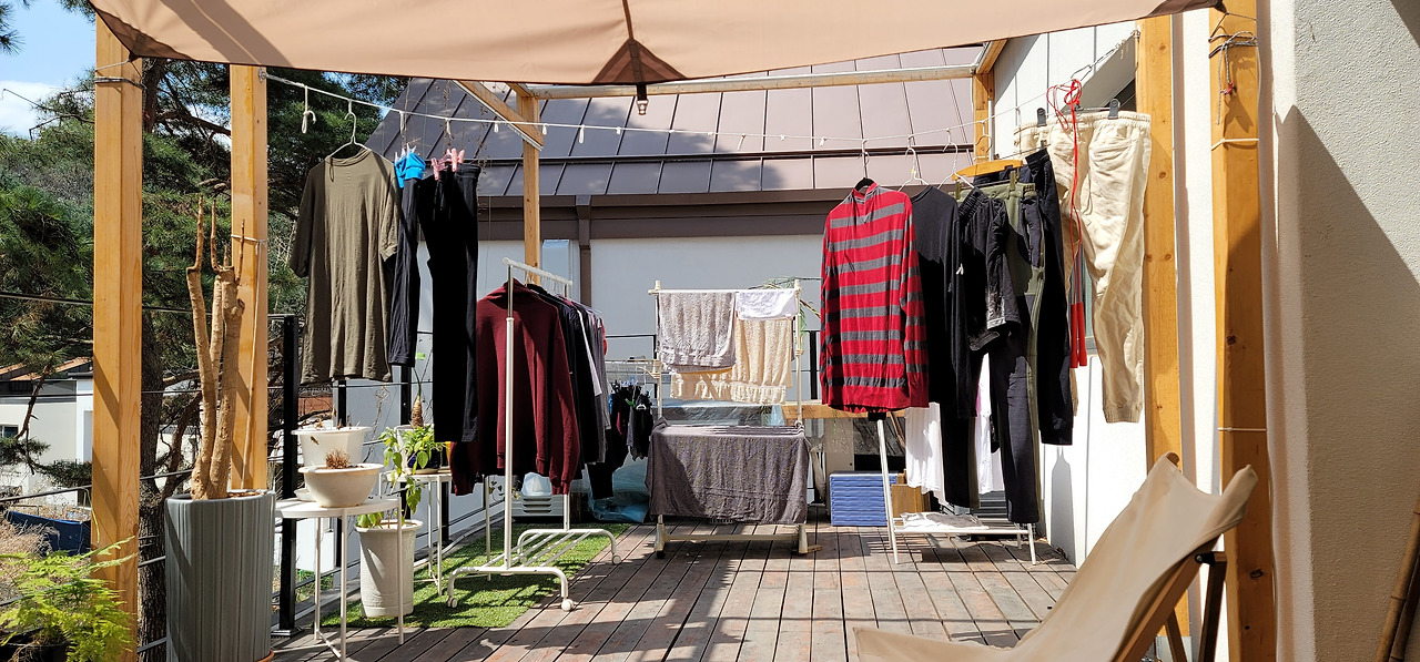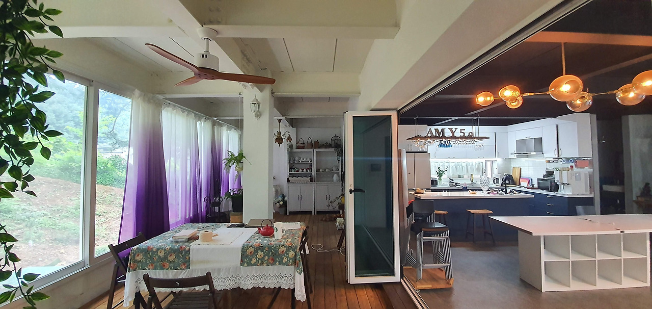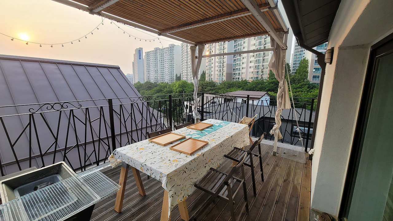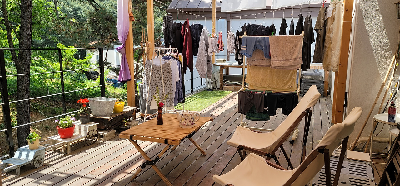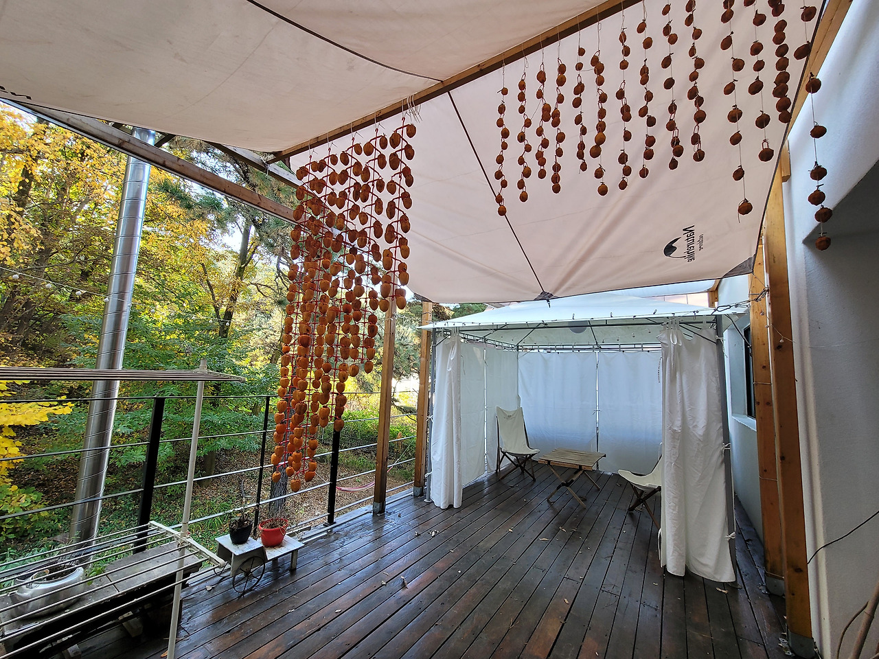 가운데 사진의 나무창 안쪽이 게스트룸. 오른쪽은 로망이었던 우드상판에 도기 싱크볼 원목 상부장의 싱크대. 보조 주방 로망이었던 원목 상판의 싱크는 사용해보니 실용성이 매우 떨어짐 게스트룸으로 사용중인 2층 침실은 산 쪽으로 낸 픽스창으로 사계절의 변화를 감상 이곳은 나와 남편이 사용하는 3층이다. 우리 부부가 사용하는 메인룸 하나가 있고 메인룸에는 드레스룸과 욕실이 있다. 3층 거실은 책꽂이와 큰 책상을 두어 서재처럼 사용한다. 2층과 마찬가지로 큰 베란다가 있고 2층의 게스트룸과 같은 크기의 세탁실이 있다. 세탁실 바닥에는 보일러를 깔아서 난방이 된다. 겨울에도 실내에서 빨래를 말릴 수 있다. 겨울 옷들은 건조기에 넣으면 수축이 되는 종류가 많아 공기 중에서 말려야 하는데 실내에 빨래를 널 공간이 있어 편리하게 사용하고 있다. 세탁실에는 작은 싱크대도 두었는데 오염이 심한 부분의 애벌세탁을 할 때 유용하게 사용하고 있다. 2층과 같은 위치에 보일러실도 있다. 린나이 보일러이고 보일러 장치의 크기가 매우 작아서 작은 찬장 놓을 정도의 공간만 있으면 충분하다. 날이 좋으면 3층 베란다에서 바비큐를 자주 먹곤 한다. 산에서 불어오는 아름다운 바람이 있어 행복한 공간이다. 이곳은 또 해가 잘 들기 때문에 세탁실에서 꺼낸 빨래를 햇빛에 널기에 최고의 장소이다. 빨래 널 때마다 햇빛과 바람에 흔들리는 빨래를 바라보는 것이 참 행복하다. 가을이 오면 감을 깎아 곶감이 만들어지길 기다리고 가지 호박 무를 말리기도 한다. 사람이 행복해지는 것은 머나먼 어려운 곳에 있는 것이 아니고 소소하지만 별 일 없이 지내는 일상, 생각보다 쉬운 곳에 답이 있었다.