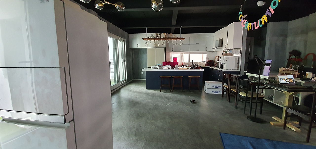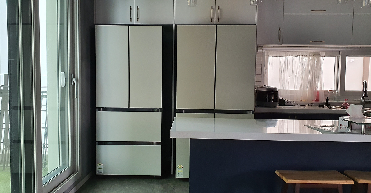 실내 건축 서적에 보면 주방 가구를 배치할 때 냉장고-준비대-개수대-조리대-가열대-식탁의 순서로 하라고 되어있다. 모눈종이 한 칸을 10cm로 정하고 냉장고의 폭 90cm 공간을 띄워서 그림을 그렸다. 제품명으로 가전제품을 검색하면 가로, 세로, 높이, 두께 등의 세부 사이즈를 알 수 있다. 사용 중이거나 구입 예정인 모든 가전제품의 가로, 세로, 높이 사이즈를 찾아서 꼼꼼하게 메모해 두었다. 위의 모눈종이 그림에 보면 아일랜드 식탁의 왼쪽에 공간이 비어 있는데 그곳으로 냉장고를 넣었다. 90cm 냉장고가 들어가야 하는 길목이고 양손으로 냉장고를 잡고 밀어 넣어야 해서 10cm를 더해 1m 폭을 띄워서 아일랜드 식탁의 위치를 잡았다. 아일랜드 식탁도 붙박이 가구라서 한번 자리 잡으면 움직일 수 없다. 특히 개수대가 들어 있어 바닥으로 수도 배선이 깔려 있기 때문에 위치를 미리 고정해 두어야 한다.