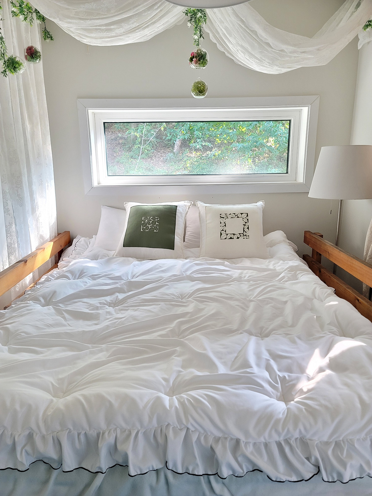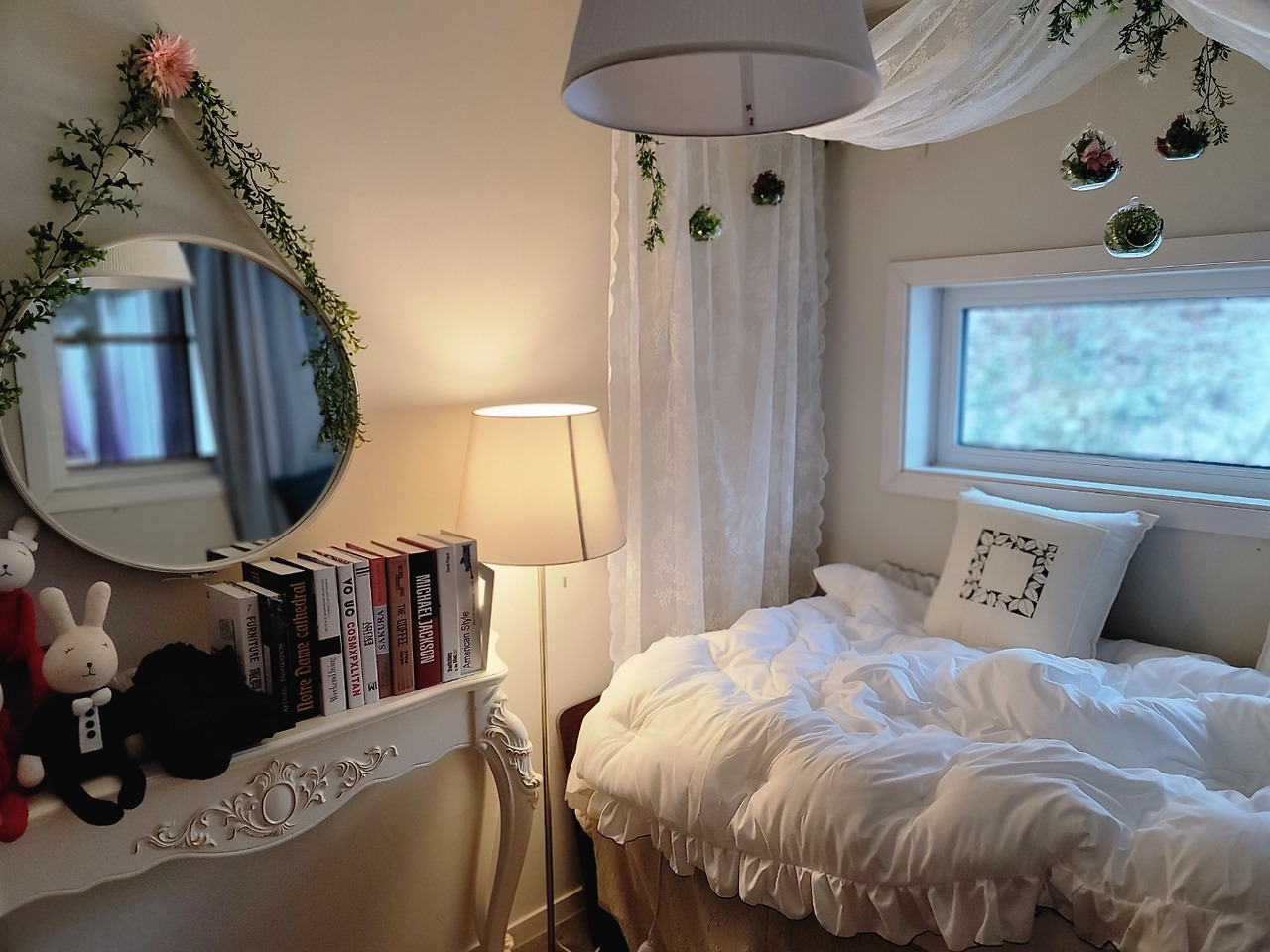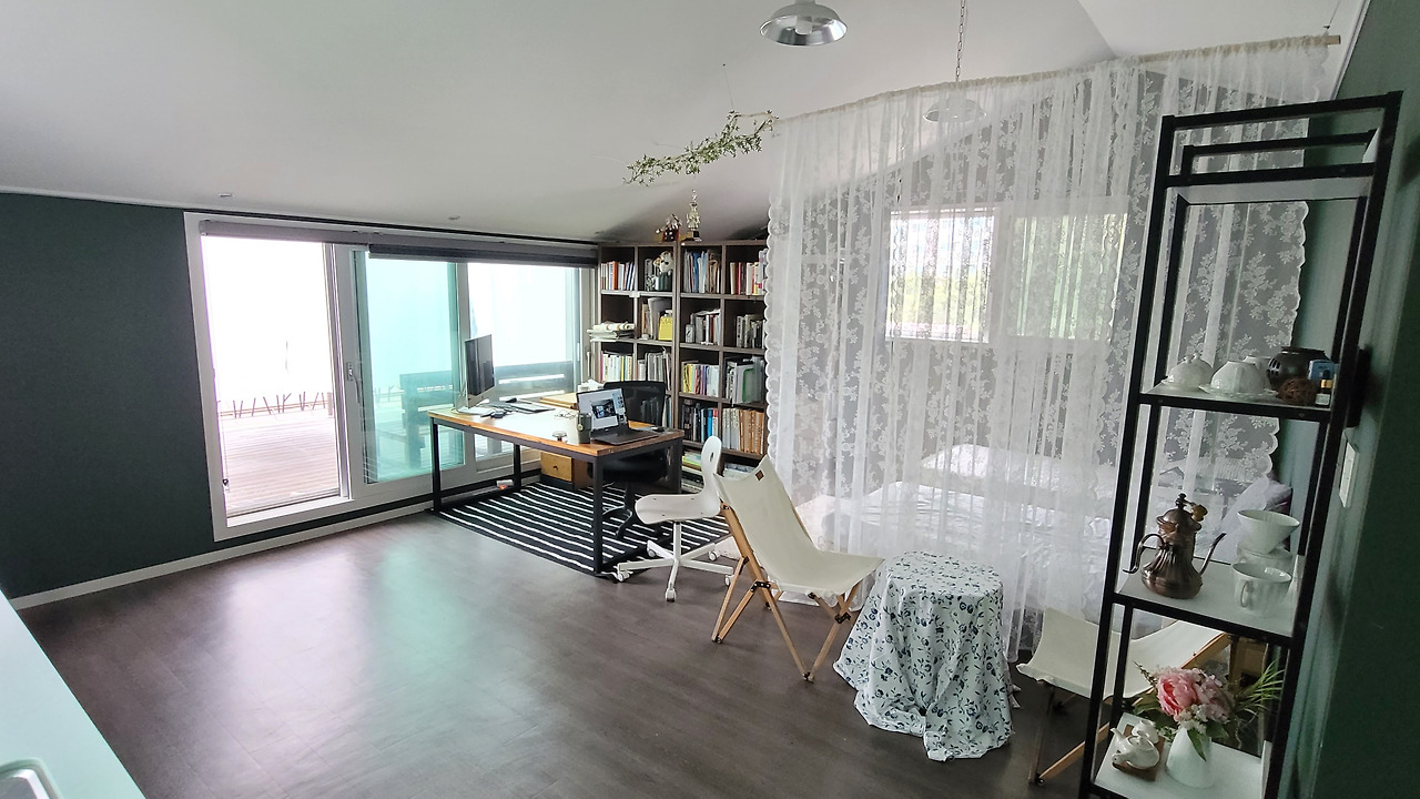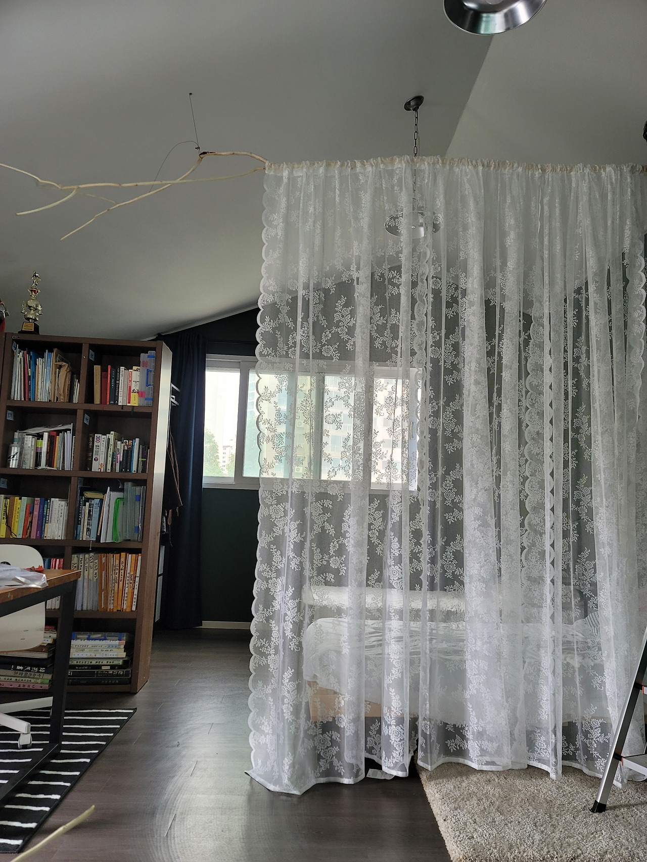 4층은 공간 구분없이 통으로 만들어서 레이스 커튼을 달아 침실 구분하고 책장 뒤 공간은 드레스룸으로 사용