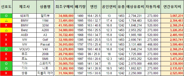 이 표를 보면서 느끼는 반응은 말리부와 비슷한 가격대에 의외로 괜찮다고 여겨지는 차들이 상당히 많다는 것이었다고 합니다. 또한 마냥 좋게만 보였던 말리부의 연비가 연간 유지비에서 디젤차에 비해서 비교적 높은 편이라는 것도 알게 되었다고 합니다. 이전에는 신성불가침의 종교 같던 말리부의 성역이 점점 눈높이에 맞춰진 느낌이 아니었을까 싶습니다. 세상에는 완벽한 차는 없습니다. 각각의 그 특징에 맞게 타면 그뿐인 듯합니다. 이렇게 비교 대상들과 함께 늘어놓고 보면 다 제 각각 개성 있는 자동차일 뿐이죠.