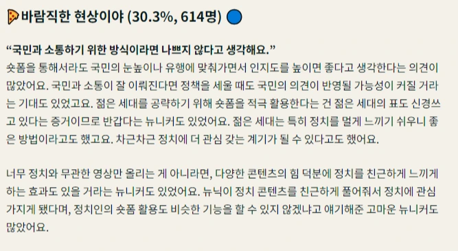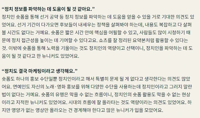 정치인의 숏폼을 긍정적으로 바라본 사람들의 의견이다.