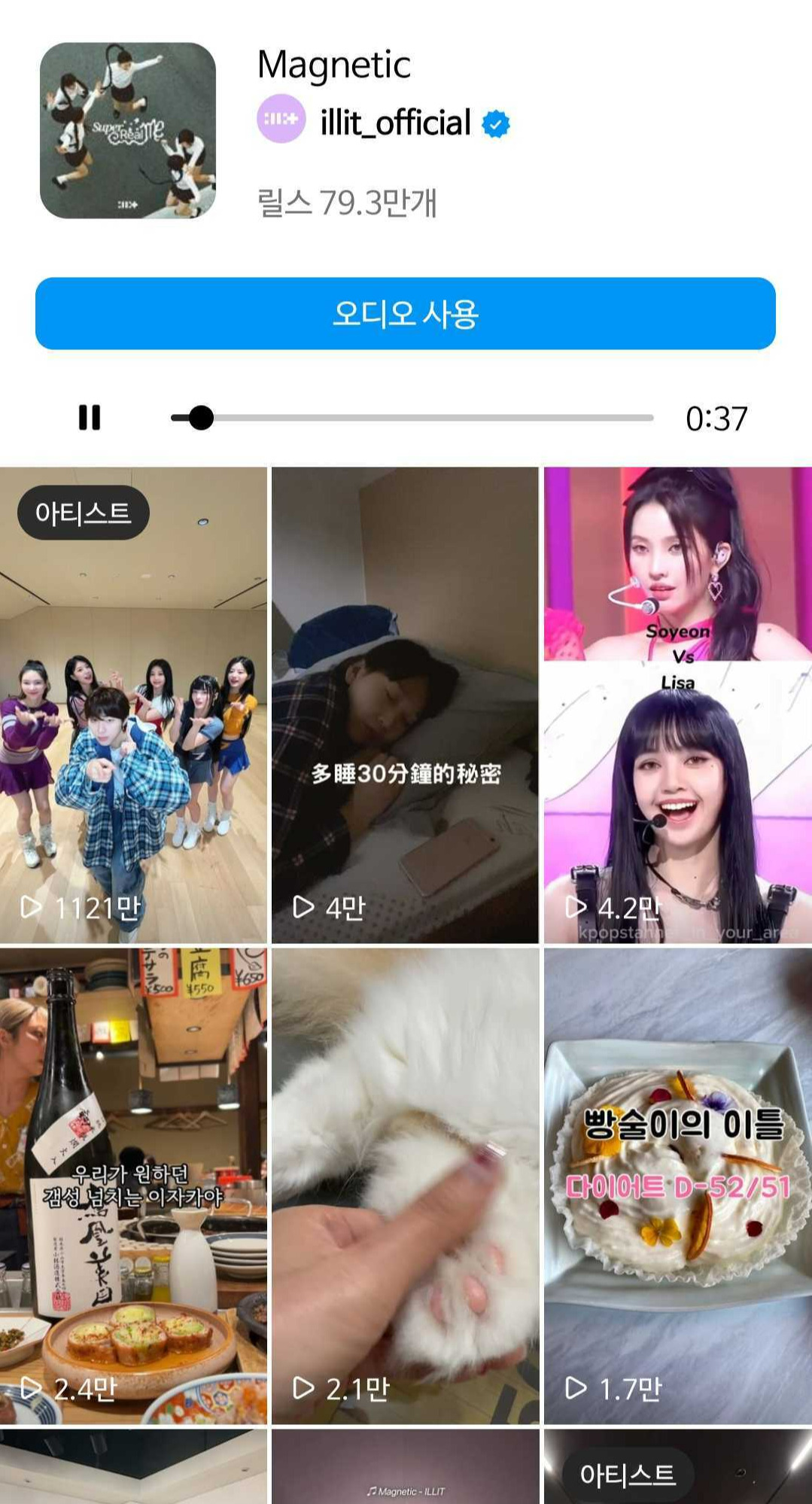 #2 마그네틱 챌린지 - 아일릿의 데뷔곡 챌린지. 음원 활용 건수가 정말 많은 것을 보면 챌린지 참여자도 많지만, 다른 영상의 배경음악으로 사용한 사람도 많은 것 같다. 특히 7~80만이라는 영상 사용 개수는 국내에서만은 절대 나올 수 있는 숫자가 아니다. 글로벌 흐름을 확실히 탔다.