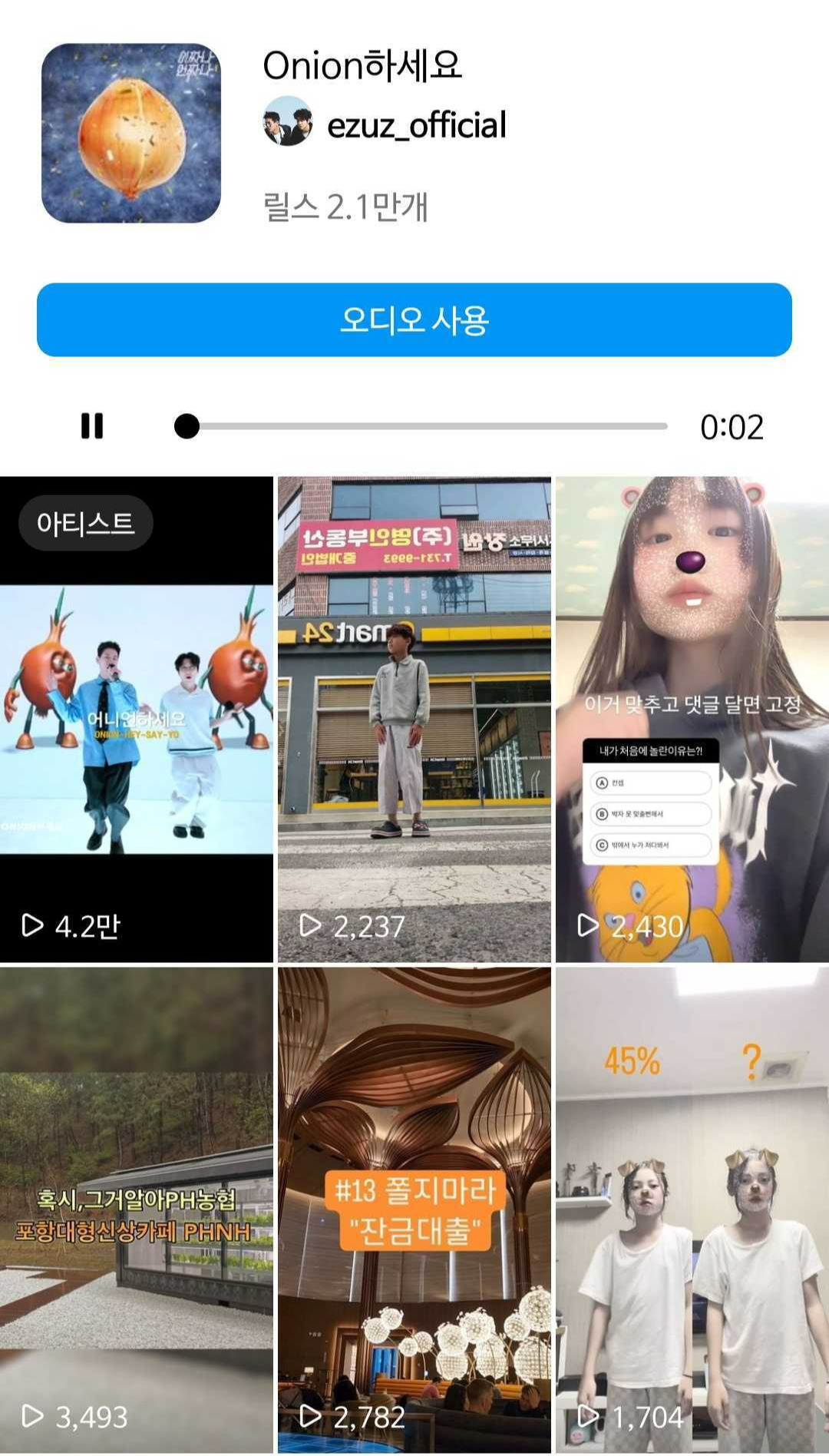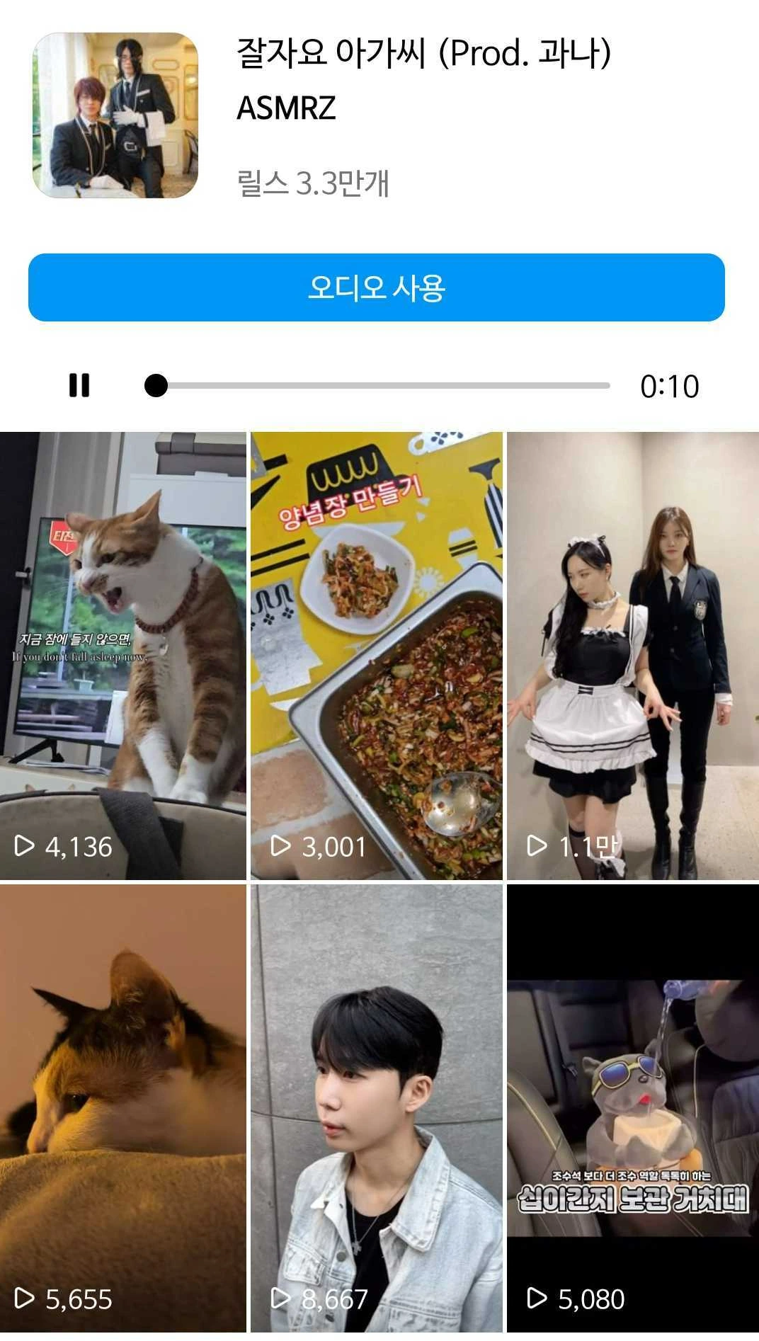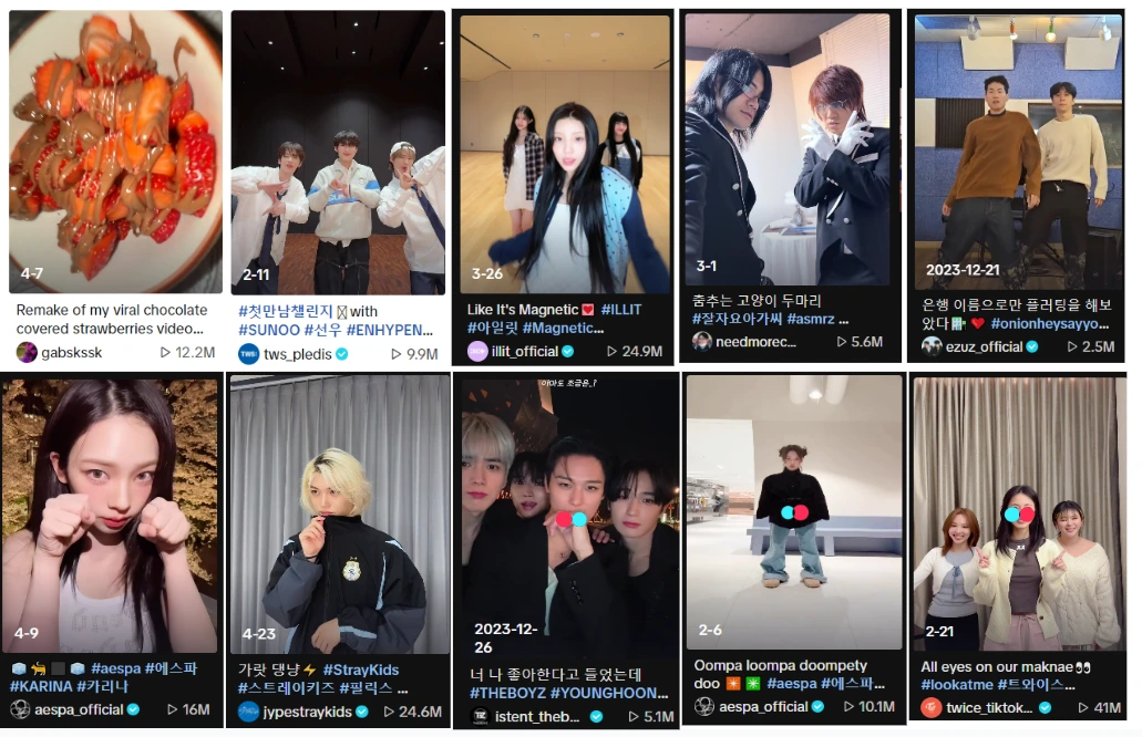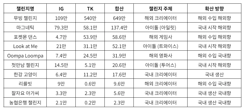 1분기의 왕좌를 쓴 영상들. 대부분이 조회수 1000만이 넘는다. 2024년 숏폼 트렌드 TOP 10은 무빙챌린지, 마그네틱 (아일릿), 포켓몬 댄스, 룩앳미 (트와이스), 움파룸파, 첫만남 (투어스), 한강 고양이, 리를빗, 잘자요 아가씨, 농협은행 순이다. 일단 인스타그램과 틱톡에서 해당 챌린지 음원의 영상 개수 순서대로 나열해보았다. 정확한 집계라곤 절대 얘기할 수 없는 것이, 해당 음원으로 만들어진 모든 영상이 챌린지 영상도 아니고, 정식 음원이 아닌 UGC나 자체 음원으로 챌린지를 올린 사람도 있다. 하지만 대략적인 규모감을 파악하기에는 나쁘지 않다.