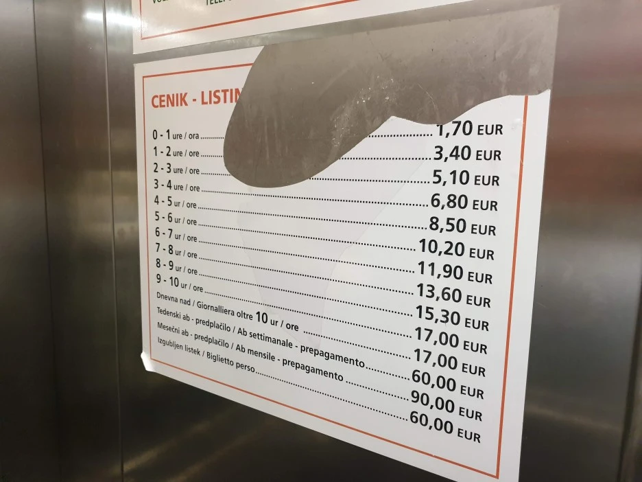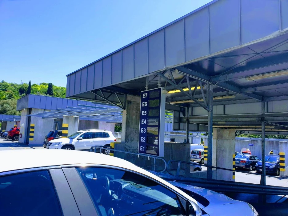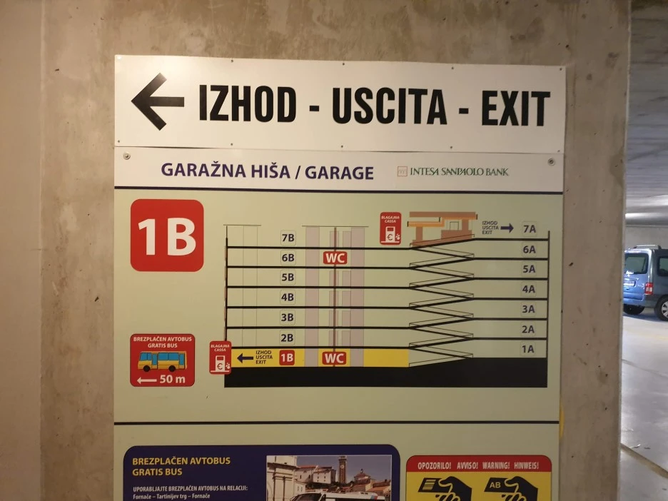 이 주차장은 겉에서 보면 1층인데 사실은 7층이다. 그 이유는 언덕 아래로 타워 형태로 이루어진 주차장이기 때문이다. 그래서 도로상으로는 1층이지만 마을에서 보면 7층이 되는 특이한 구조로 이루어져 있다. 주차는 1층이나 7층에 하는 것이 좋다. 주차정산기가 1층과 7층에만 있기 때문이다. 주차를 하고 무료로 제공되는 셔틀버스를 타면 타르티니 광장까지 데려다준다. 올 때도 타르티니 광장 앞에서 타면 된다.