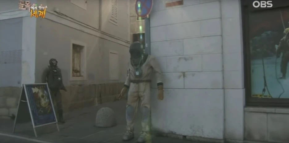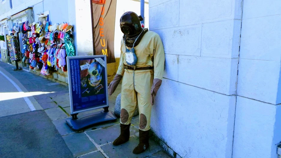화면에서 보던 그 길을 똑같이 걷는 느낌은 색달랐다. 보통 여행다큐의 첫 출발지점을 화면만 보고는 찾기 어렵다. 하지만 피란은 작은 마을이고 마을로 들어서는 길이 하나뿐이라 쉽게 찾을 수 있었다. 가다 보니 화면에서 본 잠수부 마네킹도 그대로 있다. 박물관 앞 전시물인데 들어가 보지는 않았다.