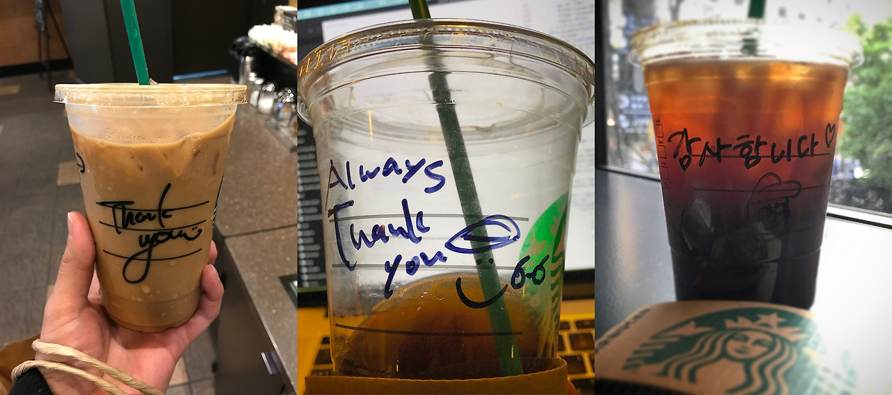 한국처럼 일본에도 스타벅스가 구석구석 많이 있지만 지점 별로 분위기나 매력들이 다른 만큼 스타벅스 브랜드와 제품을 좋아하시는 분들은 다양한 지역에 스타벅스들을 방문하시면 좋은 추억들을 많이 만들 수 있을 거라 생각해요. 대부분의 스타벅스는 한국과 별반 차이를 느낄 수 없을 정도로 인테리어도 비슷하지만 다소 외각이나 번화가가 아닌 곳의 경우는 건물도 이쁘고 분위기들도 많이 다름을 느낄 수 있어요. 그리고 무엇보다 저에게 인상적이었던 건 컵에 이쁜 그림이나 메시지를 그려주는 지점이 많아요. 심지어 한 지점에선 어떻게 알았는지 제게 한국어로 그려주는 감동 이벤트를 선사했답니다! 일본 스타벅스에 방문하시면 무심결에 지나칠 수도 있는 컵에 그려지는 그림들도 꼭 확인해보세요~! 그럼 한국에서도 일본에서도 즐거운 스타벅스 라이프 즐기시고 숨어있는 혜택들도 잘 챙기세요! ^^
