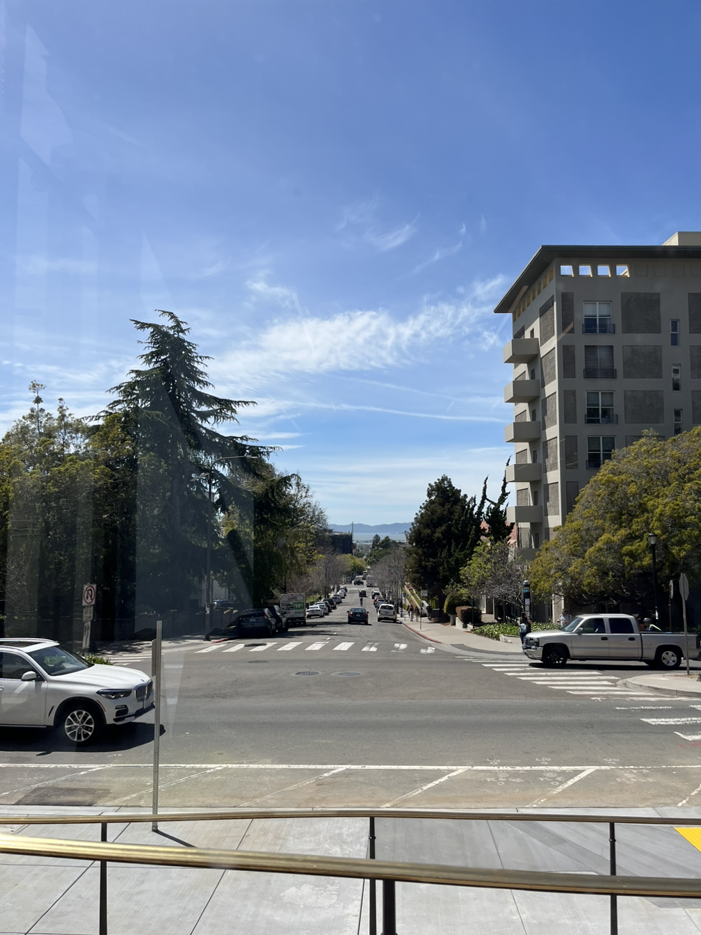 이 기숙사에는 카페가 하나 있다. 이 기숙사의 설립에 관여한 에드먼즈 씨의 성을 따서, 카페 이름은 에드먼즈(Edmonds)가 되었다. 전형적인 미국식 이름 붙이기 기법이다. 어쨌든 이 카페는 여러 모로 나의 ‘최애’ 카페이다. 우선, 아울렛 — 충전기를 꼽는 곳이 한국어로 뭐였는지 갑자기 생각이 나지 않는다 — 이 많고 와이파이가 잘 터져 ‘카공’하기 딱 좋다. 그런데 그것보단, 아래 사진처럼 버클리의 지형이 한눈에 내다보이고 저 멀리 금문교가 보이는 창가에 바 테이블(bar table)이 있다는 점이 마음에 든다.