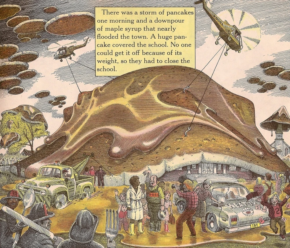 전형적인 액자구조를 가지고 있는 이 책에는 할아버지와 손주들이 살고 있는 현실적인 세계의 이야기가 있고, Chewandswallow라는 가상의 마을이 등장하는 이야기 속 이야기가 나옵니다. 나름 현실적 설정의 세계는 그저 검은 펜선의 흑백 그림으로 묘사되어 있고, 이야기 속 이야기인 Chewandswallow 마을에서 벌어지는 사건들은 컬러감이 가미되어 상상력을 좀 더 자극하죠. 사실 이 이야기의 백미는 마을 사람들의 탈출이 시작되기 직전까지의 온갖 음식 날씨의 묘사에 있습니다. 나뭇가지 여기저기 꽂혀있는 달걀프라이, 우산을 뒤집어 비처럼 받아 마시는 주스, 서쪽 언덕에 자리 잡은 어마어마한 크기의 젤로를 통과해 석양빛이 은은하게 빛나는 장면까지 다 큰 어른들까지도 머릿속에서 장면을 상상하게 하는 매력이 있죠.
