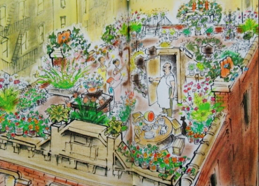 이 그림책의 클라이맥스는 상당 기간 비밀로 간직했던 정원을 삼촌에게 오픈하는 순간입니다. 특이하게도 이 장면은 아무 설명이 없이 그림으로만 표현되고 있습니다. 삽화가인 David Small이 아련한 수채물감으로 꽃으로 뒤덮인 옥상정원을 보여주고 있는 가운데, 막 옥상으로 들어선 듯한 삼촌의 얼굴은 미소를 짓기는커녕 너무 놀라 차라리 멍해 보입니다.