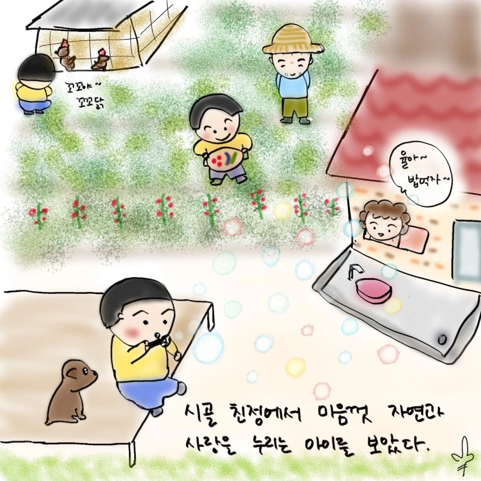 잠시 내려갔던 시골 엄마아빠 집 작은 텃밭에서 자연을 누리는 아이를 보았다. 갈 곳 잃은 서울에서는 온종일 눈이 퀭~해지도록 넷플릭스에 의지하는 수밖에 없었는데, 자연 속에서 아이는 참 밝고, 활기차고, 즐거워보였다.