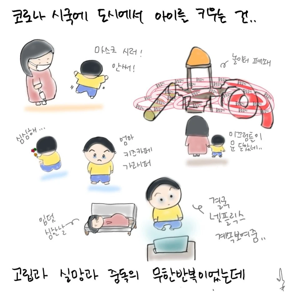 코로나19가 터지면서 첫째의 가정보육과 집콕생활이 이어졌다. 동네의 모든 놀이터는 폐쇄되었고, 서울의 인구밀도를 생각했을 때 키즈카페든 백화점이든 감염의 염려가 매우 컸기에 우리는 갈 곳을 잃었다. 코로나 초반에는 아이가 마스크에 적응하는 것도 고역이었다.