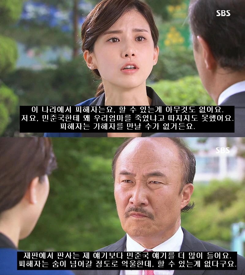 드라마 <너의 목소리가 들려>의 한 장면이다. 법이 어떻게 피해자를 소외시키는지 단적으로 보여준다. 사회는 피해자의 이야기보다는 가해자가 왜 범죄를 저질렀는지 그 이유를 궁금해한다. 가해자가 어떤 어린시절을 보냈기에 저런 사람이 되었나 그 서사에 더 관심을 갖는다.