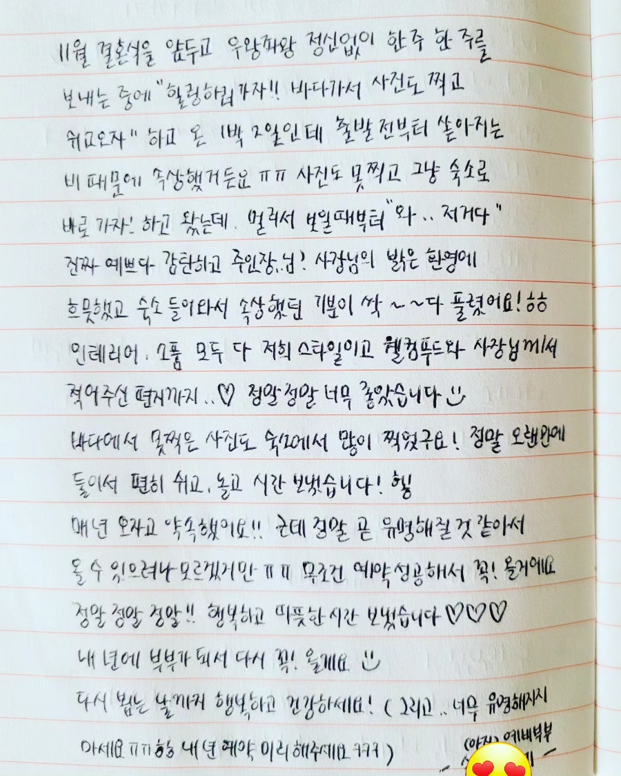 11월 결혼식을 앞두고 우왕좌왕 정신없이 한 주 한주를 보내는 중에 "힐링하러 가자! 바다 가서 사진도 찍고 쉬고 오자"하고 온 1박 2일인데 출발 전부터 쏟아지는 비 때문에 속상했거든요. 사진도 못 찍고 그냥 숙소로 바로 가자! 하고 왔는데, 멀리서 보일 때부터 "와... 저거다" 진짜 예쁘다 감탄하고 사장님의 밝은 환영에 흐뭇했고 숙소 들어와서 속상했던 기분이 싹 다 풀렸어요.