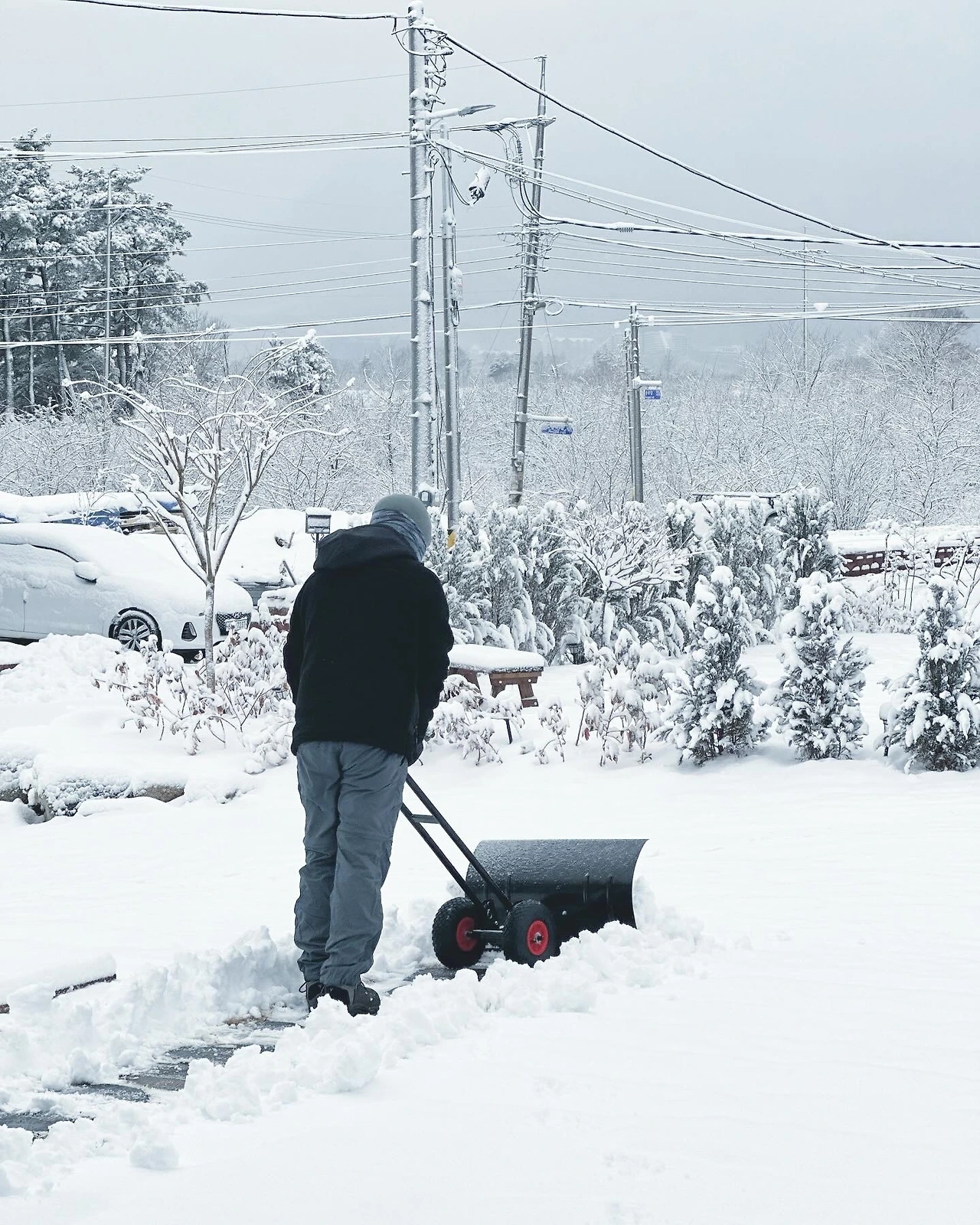 이후에도 날씨 관련 에피소드는 차고 넘친다. 온수기 사용 안내문도 큼지막하게 붙여놓고, 동파방지와 제설장비 준비에 아주 심혈을 기울이느라 긴장감 도는 1월을 보냈다. 눈이 어마어마하게 많이 왔다. 아침에 일어나 눈 떠보니 눈이 허벅지까지 쌓여있는 날이 며칠째 이어졌다. 겨울왕국의 낭만은 짧고, 제설은 길다. 삽을 들고 열심히 눈을 퍼 나르고 있는데 큰 길가로는 엄청 큰 제설차가 지나갔다. 제설차자 돌아다니니 안심이 들면서도 우리 집 앞 골목도 들어와 주면 좋겠다는 욕심이 뒤섞였다. 하루는 대폭설로 인해 온 가족이 고립되고, 예약 손님께도 취소 요청을 드렸다. 처음 있는 일이었다. 입춘에도 춘분에도 눈이 왔다.