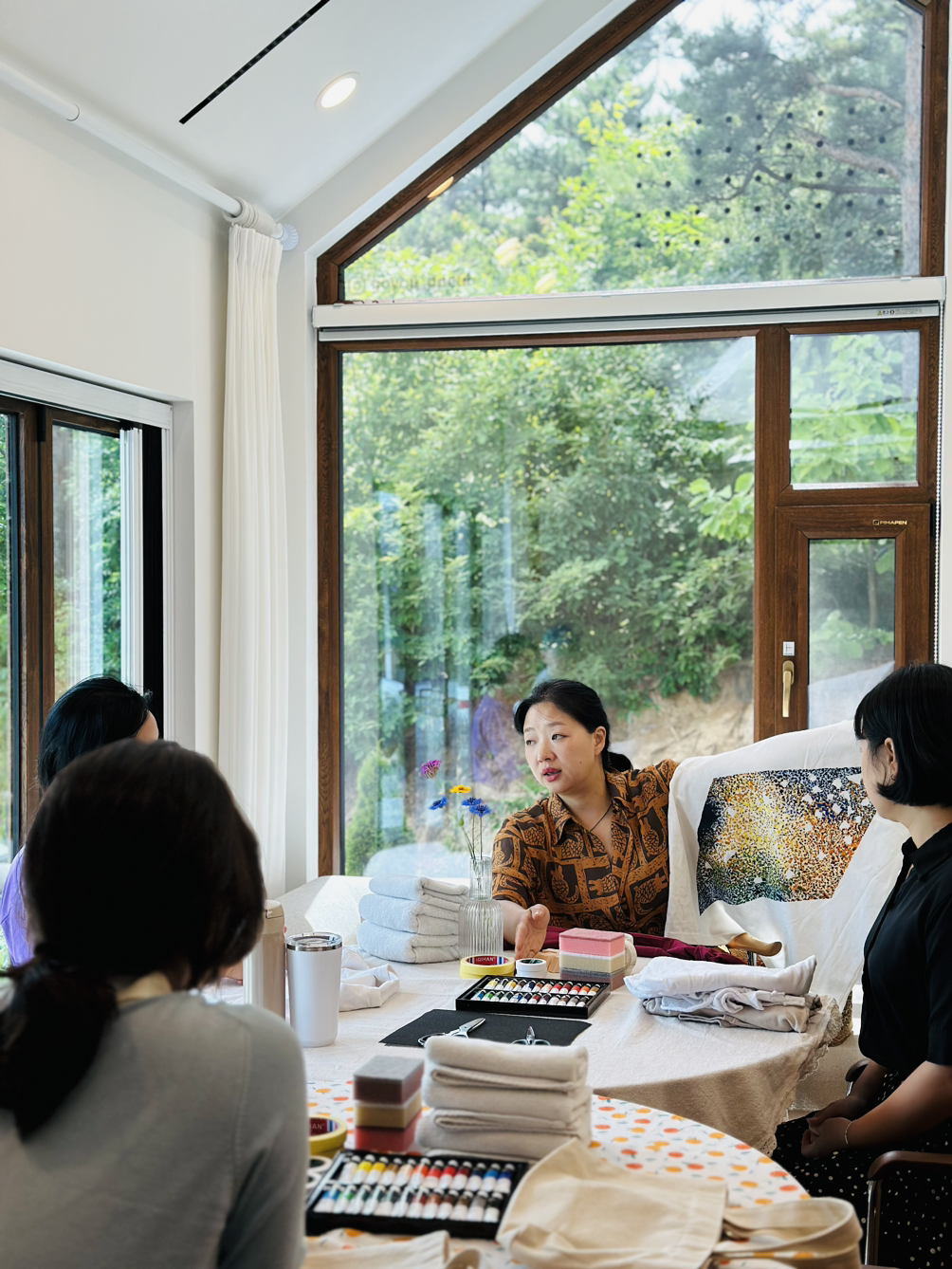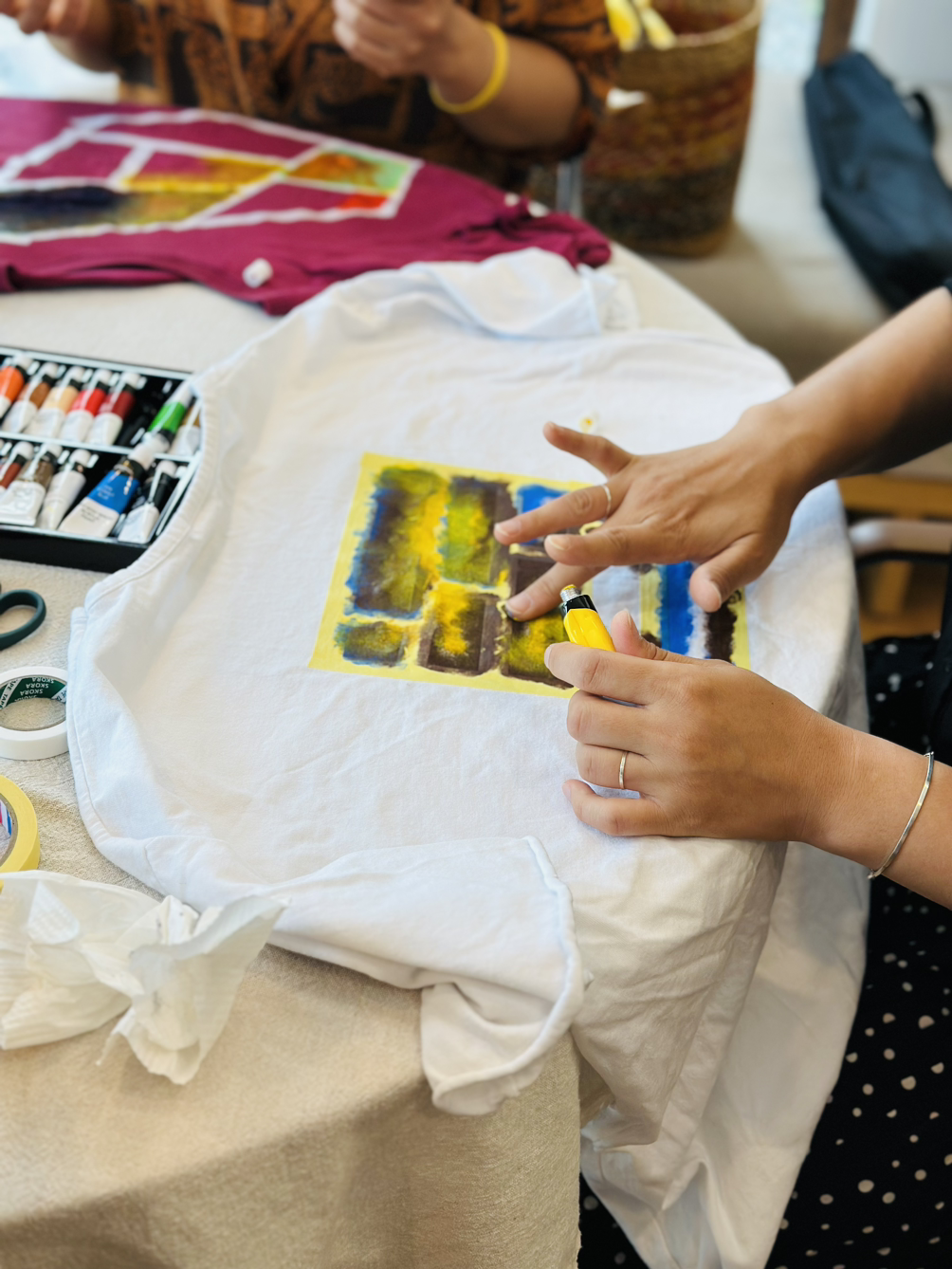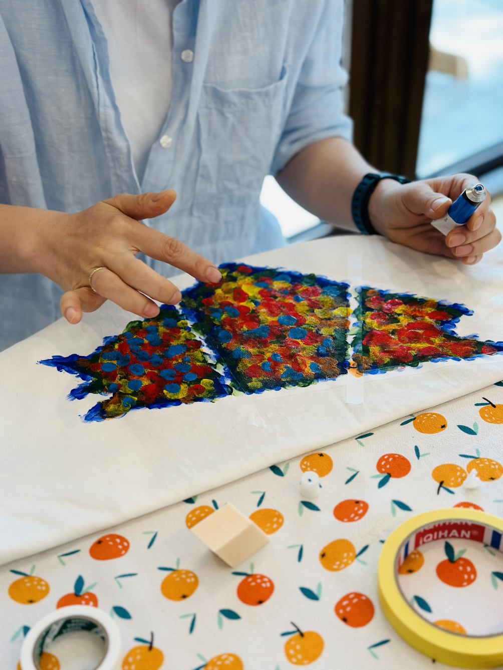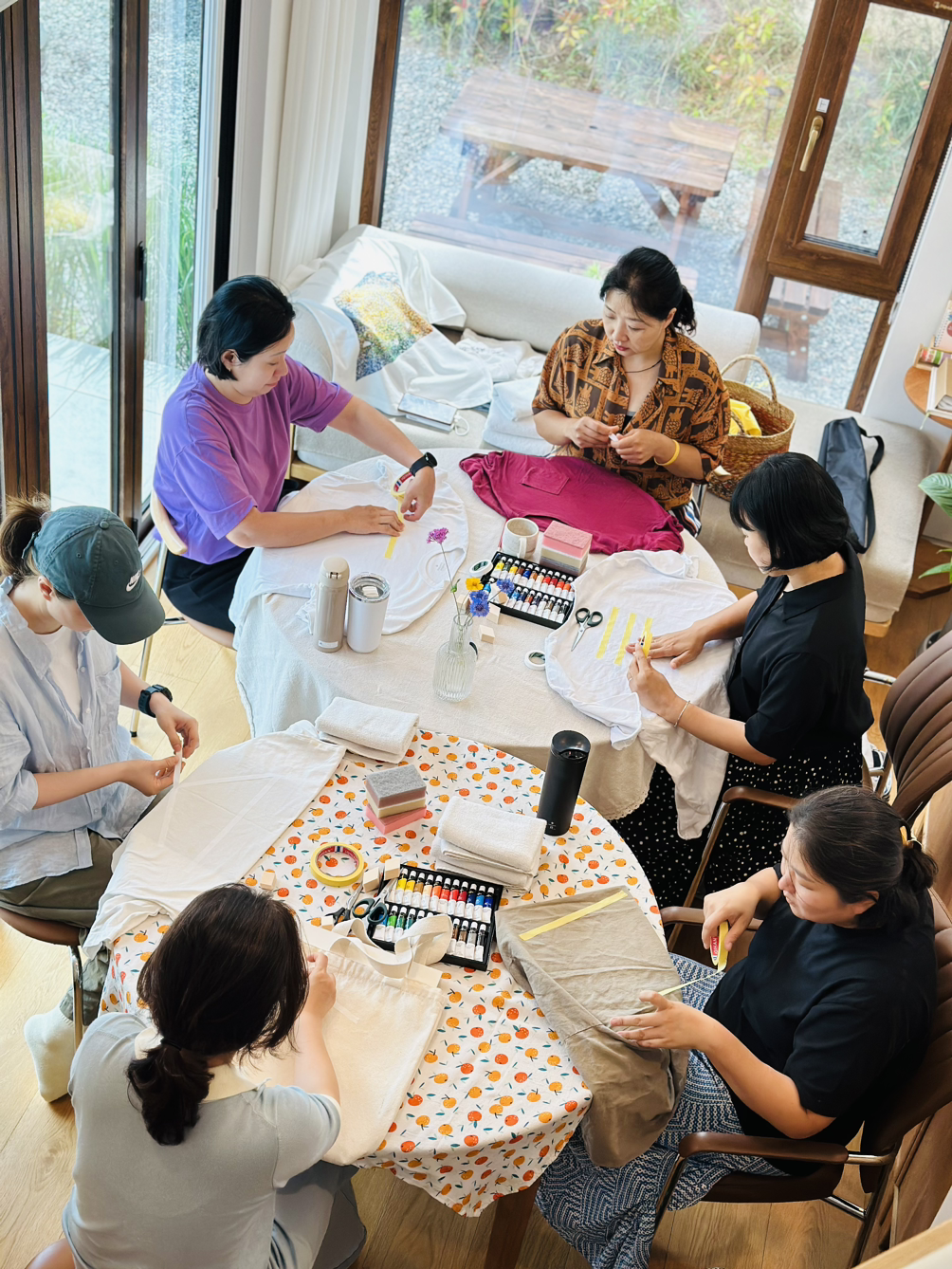 고성과 속초 양양에서 다양한 사람들이 모였는데 모두 여성이었다. 사랑방에 모인 마을이웃처럼 조잘조잘 사는 이야기 나누며 시간 가는 줄도 모르고 작업을 했다. 각자 챙겨 온 기름이 튄 티셔츠, 마음에 들지 않는 로고가 크게 그려진 에코백, 오래 입고 싶은 바지에 마스킹 테이프로 테두리 모양을 만들고 그 사이를 아크릴 물감을 손가락으로 콕콕 찍어서 각양각색으로 꾸몄다. 테이프를 떼면 반듯한 모서리가 생겨났다. 그 희열감이란. 작업물을 충분히 말릴 동안 준비한 오일파스텔과 아크릴물감으로 자화상 그리기까지 진행했다. 두 시간이 순식간에 흘러갔다.