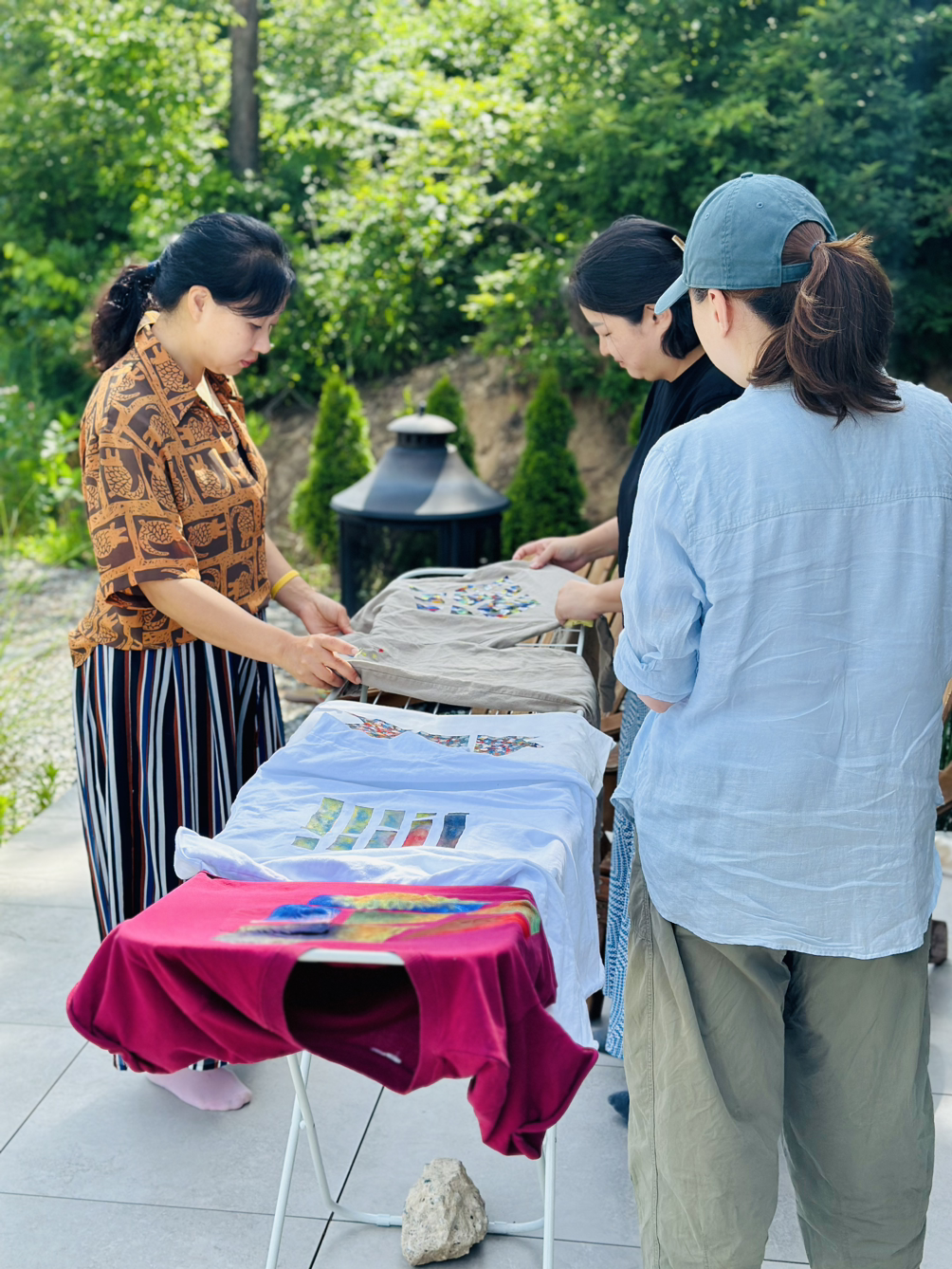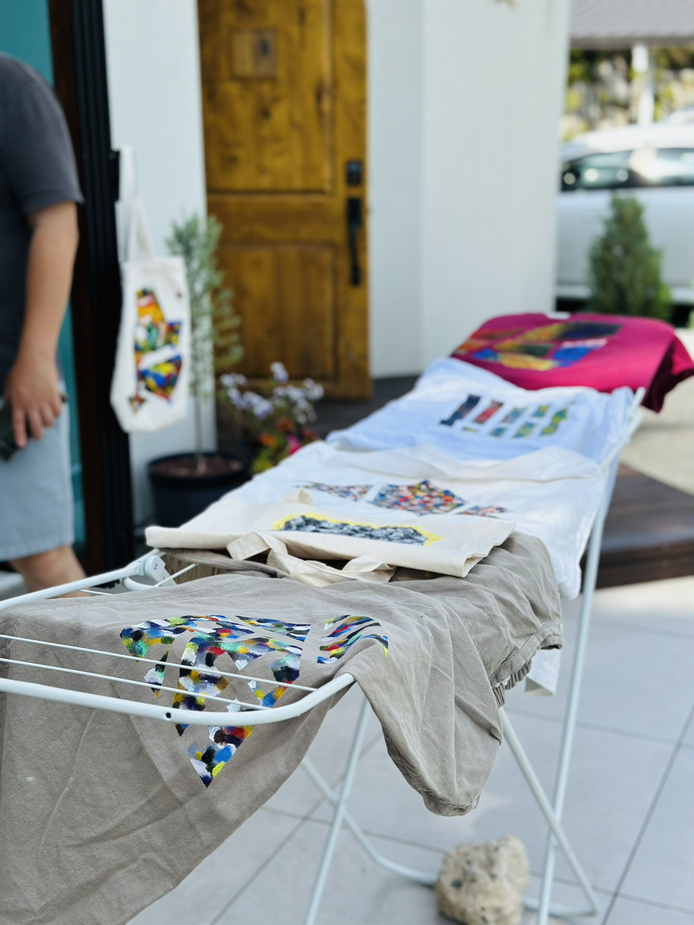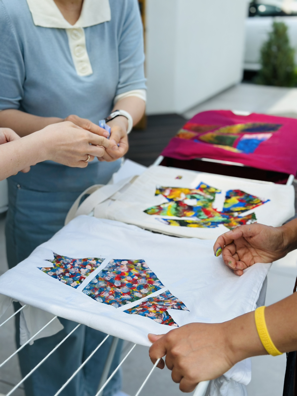 고성과 속초 양양에서 다양한 사람들이 모였는데 모두 여성이었다. 사랑방에 모인 마을이웃처럼 조잘조잘 사는 이야기 나누며 시간 가는 줄도 모르고 작업을 했다. 각자 챙겨 온 기름이 튄 티셔츠, 마음에 들지 않는 로고가 크게 그려진 에코백, 오래 입고 싶은 바지에 마스킹 테이프로 테두리 모양을 만들고 그 사이를 아크릴 물감을 손가락으로 콕콕 찍어서 각양각색으로 꾸몄다. 테이프를 떼면 반듯한 모서리가 생겨났다. 그 희열감이란. 작업물을 충분히 말릴 동안 준비한 오일파스텔과 아크릴물감으로 자화상 그리기까지 진행했다. 두 시간이 순식간에 흘러갔다.