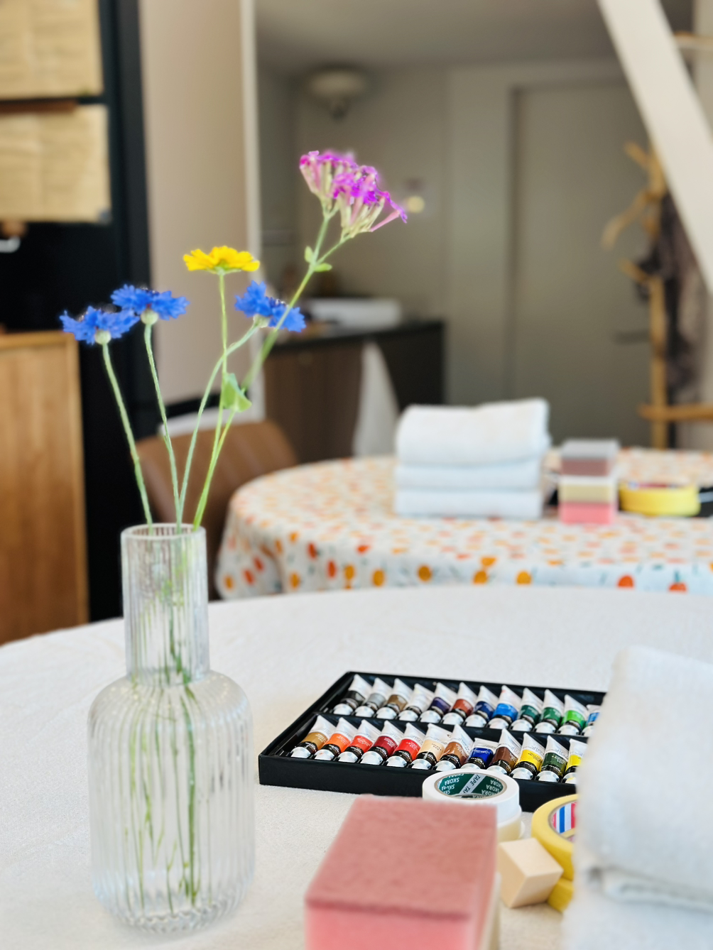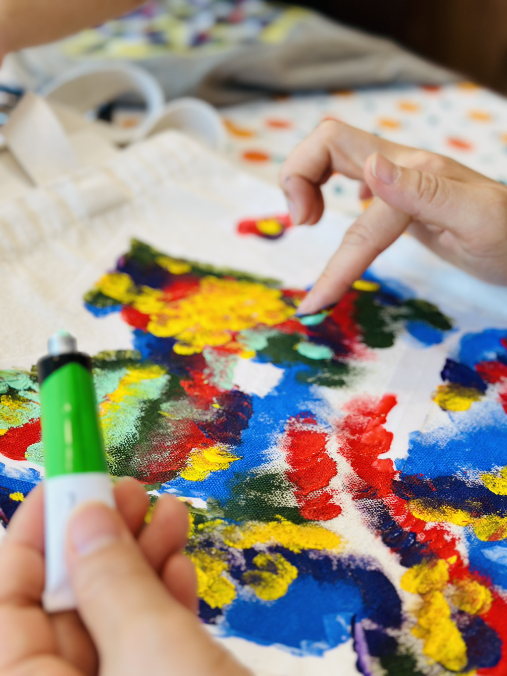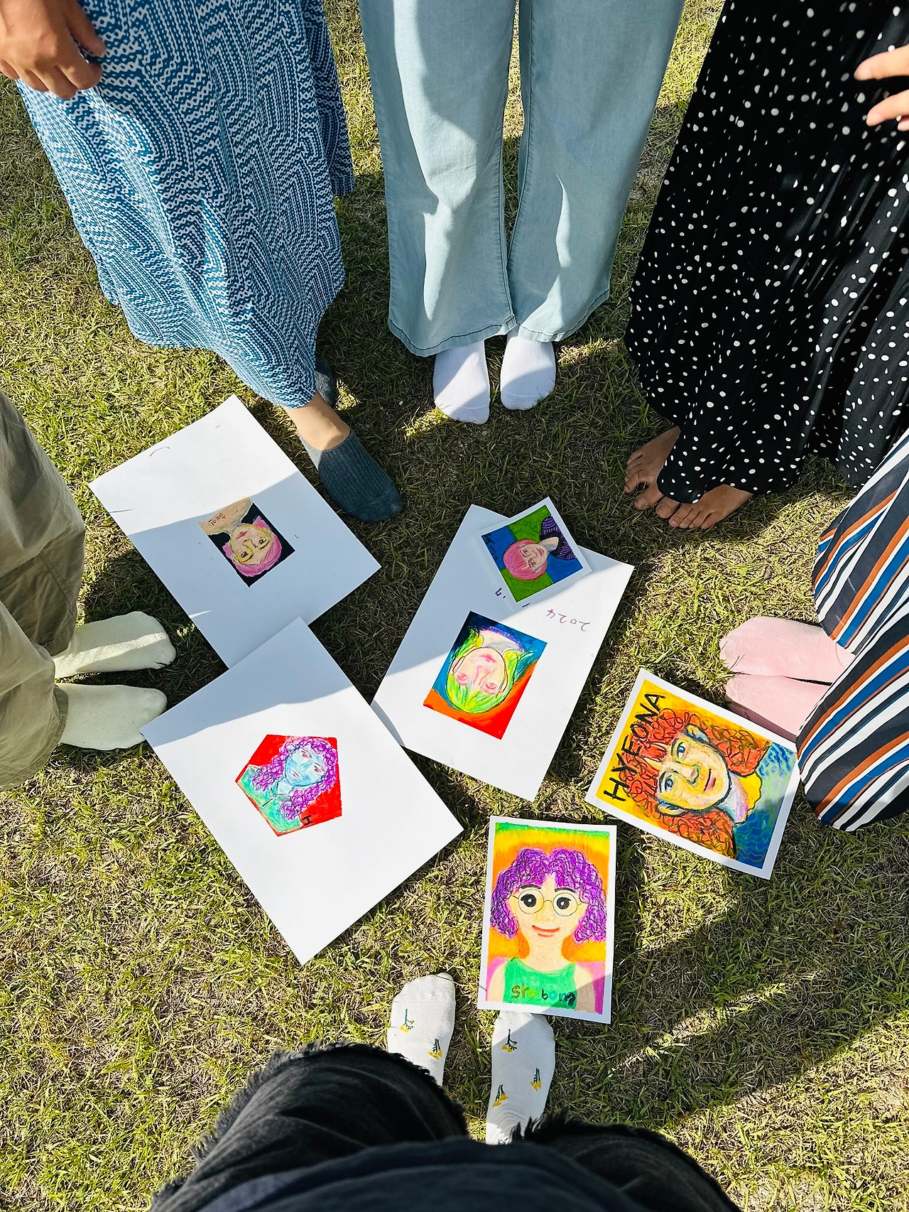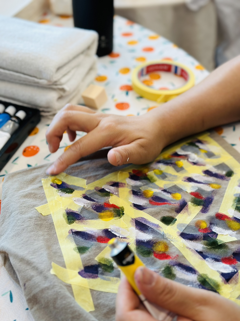 고성과 속초 양양에서 다양한 사람들이 모였는데 모두 여성이었다. 사랑방에 모인 마을이웃처럼 조잘조잘 사는 이야기 나누며 시간 가는 줄도 모르고 작업을 했다. 각자 챙겨 온 기름이 튄 티셔츠, 마음에 들지 않는 로고가 크게 그려진 에코백, 오래 입고 싶은 바지에 마스킹 테이프로 테두리 모양을 만들고 그 사이를 아크릴 물감을 손가락으로 콕콕 찍어서 각양각색으로 꾸몄다. 테이프를 떼면 반듯한 모서리가 생겨났다. 그 희열감이란. 작업물을 충분히 말릴 동안 준비한 오일파스텔과 아크릴물감으로 자화상 그리기까지 진행했다. 두 시간이 순식간에 흘러갔다.