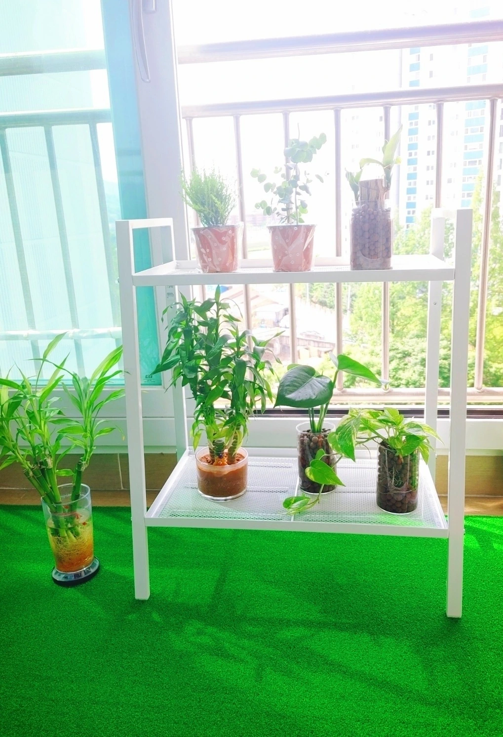 베란다에 인조잔디를 깔고 이케아 2단 선반 위에 식물들을 올려두었다. 현실과 이상의 타협점, 상큼한 초록색 인조잔디는 볼 때마다 흐뭇하다.