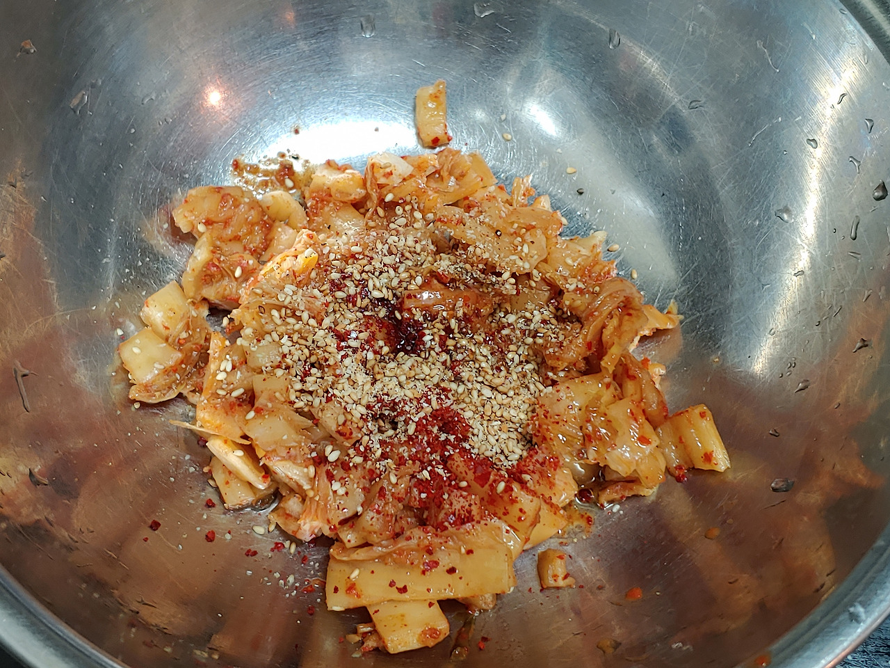 김치 고명 : 잘 익은 김치, 참기름 듬뿍, 고춧가루, 설탕 한 꼬집