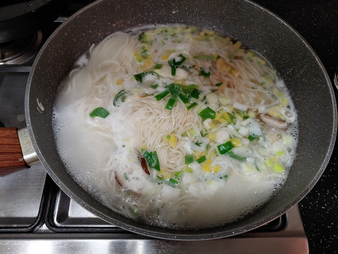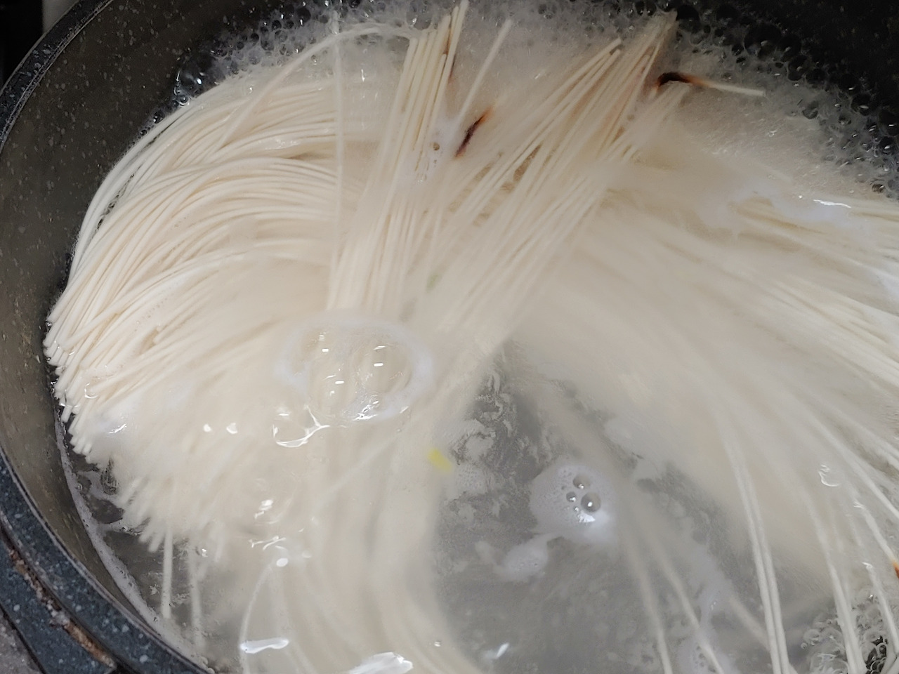 소면을 넣고 끓여 오르면 물을 한두 번 더 넣어 끓여 준다.