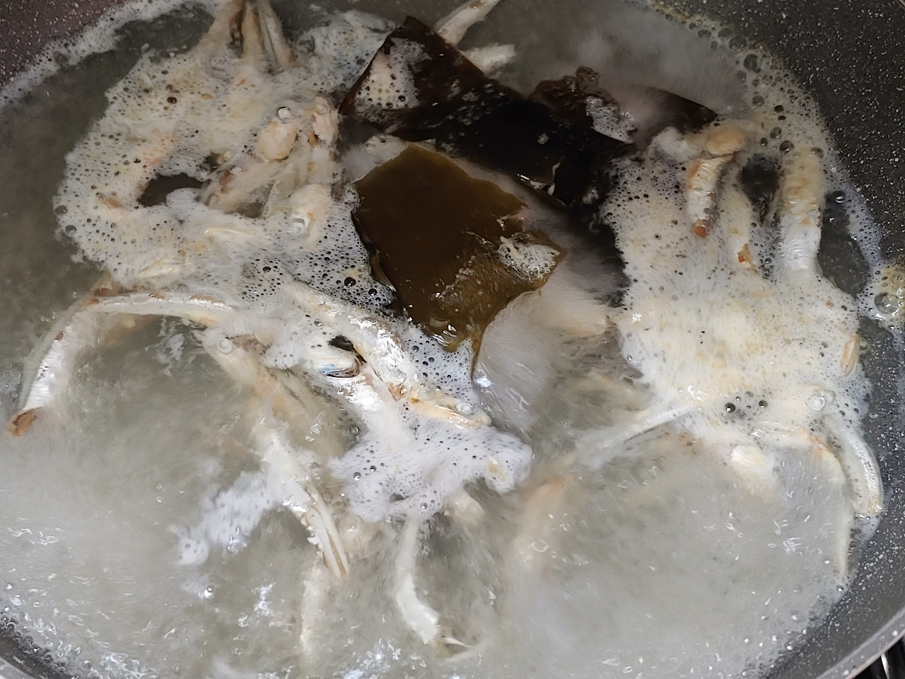 보통은 다시마를 10분 후에 꺼내 주는데 내 경우는 끝까지 육수를 낸다. 끈적임은 거품과 함께 걷어 내면 별 문제가 되지 않는다.