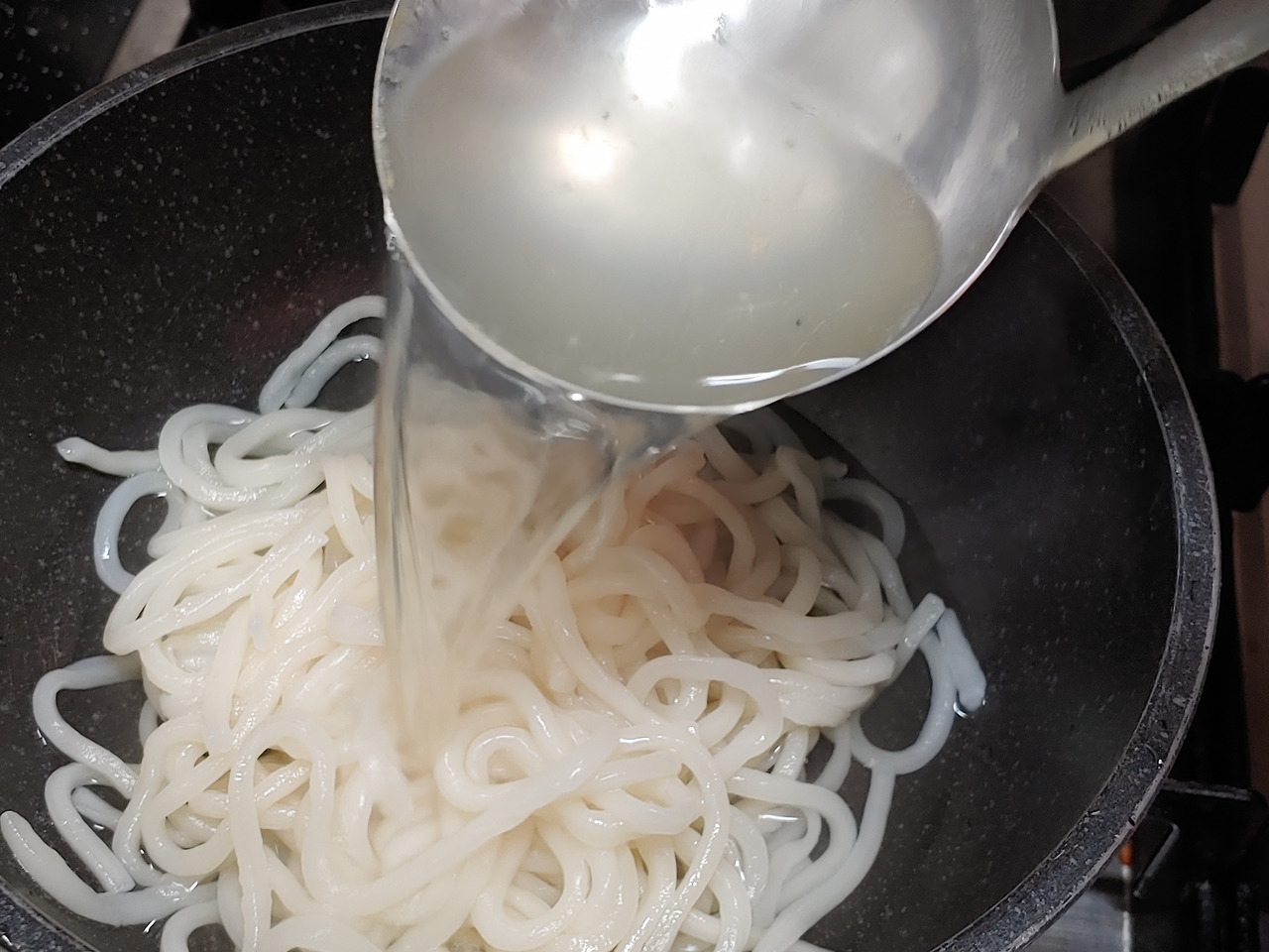 면이 어느 정도 익으면(완전히는 익히지 마세요. 육수 넣고 또 끓여야 해요) 건져 육수를 부어 다시 한번 끓인다.