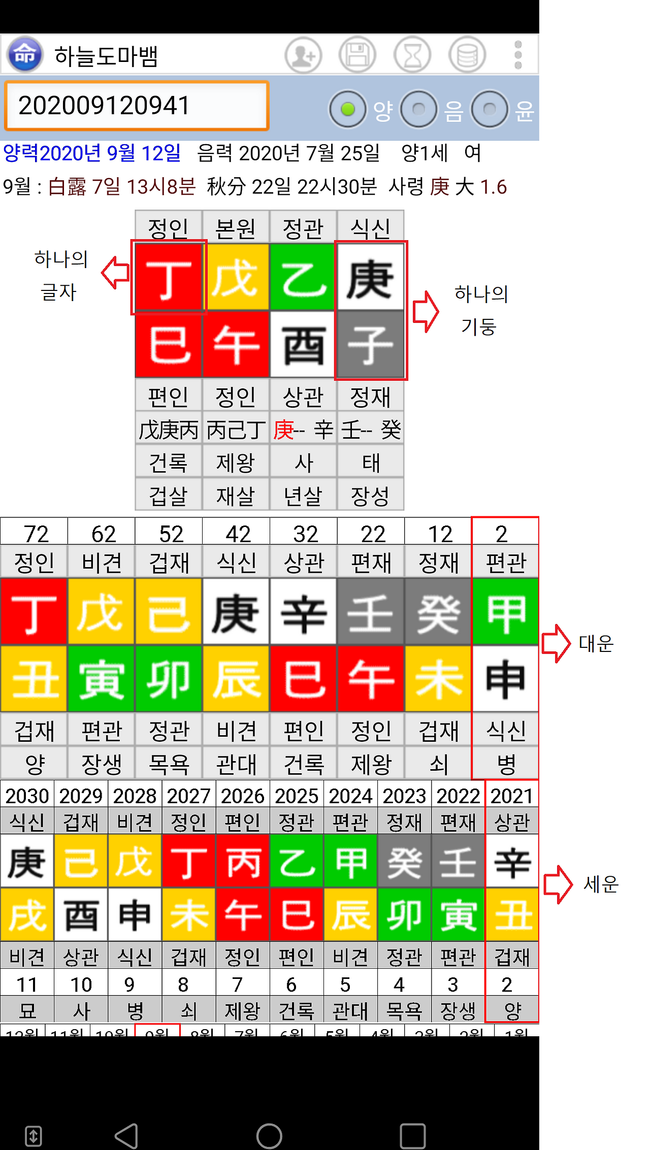사주란 4개의 기둥과 8개의 글자를 말하는데 2020년 9월 12일 9시 41분(양력)에 태어난 사람의 사주를 만세력에 넣으면 아래 그럼 처럼 나온다. 그리고 10년마다 한 번씩 바뀌는 운이 있는데 그걸 대운이라 부른다.