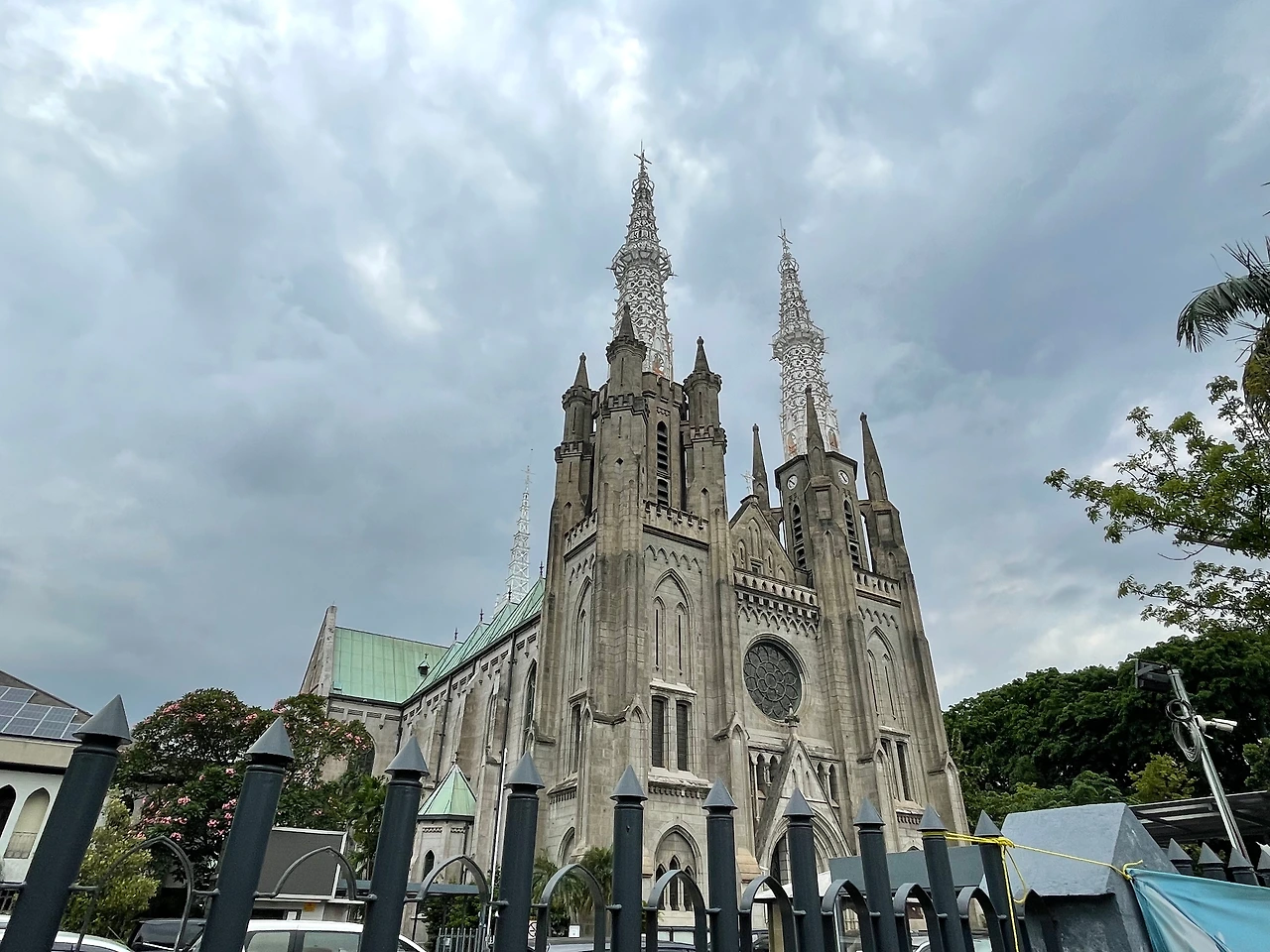 모나스 광장에 수많은 인파와 툭툭 그리고 노점들을 지나자 얼마 지나지 않아 성당의 첨탑과 모스크의 돔이 보이기 시작했다. 먼저 성당에 들어가기 위해 차를 세웠다. 인구의 대부분이 이슬람교를 믿는 나라에 이렇게 큰 성당이 있다는 사실에 감탄하고, 단단한 성벽 같은 성당의 외벽을 감상하며 성당 내부로 향했다. 내부에 들어가려고 하자 성당 안내원이 이제 곧 미사가 시작될 것이며 성당 안은 신자들로 가득 차 들어갈 수 없다고 했다. 천주교 신자인 우리도 이렇게 된 이상 미사를 보자는 심산으로 미사가 언제 끝나는지 물었고 2시간 뒤라는 답을 받았다. 우린 그렇게 성당을 나왔다.