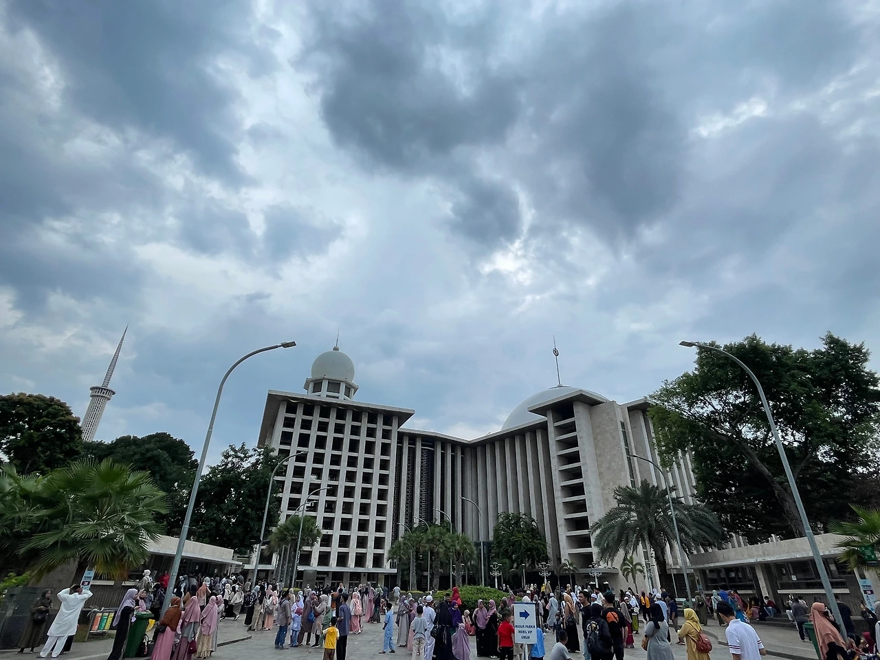 대성당과 이스티크랄 사원은 도로 하나를 사이로 마주 보고 있다. 이는 다양한 종교를 포용한다는 인도네시아 사회의 지향점을 나타낸다. 실제로 거리상으론 지척이지만, 전혀 멈출 기미가 보이지 않는 차들이 달리는 도로를 건너기는 쉽지 않았다. 한참 길을 건너지 못하자 이슬람 사원 입구에서 작은 노점을 하는 청년이 우리를 위해 차량을 통제해 주었다. 그의 배려 덕분에 무사히 이슬람 사원에 입장할 수 있었다. 생각지도 못한 배려로 여행하고 있다는 실감이 들었고 한편으론 부끄러웠다. 이슬람 사원 앞엔 사람이 많아 소매치기당할까 봐 잔뜩 걱정하고 있었고, 도움을 받을 때도 무언갈 팔거나 요구하지 않을까 하는 생각이 들었기 때문이다. 그렇게 도착한 이슬람 사원의 내부에 들어가려고 하자 경비원이 사원 폐장 시간이라서 들어가지 못한다고 했다. 하지만 사원 마당에선 얼마든지 사진을 찍어도 된다며 친절히 알려주었다. 인도네시아 단체 관광객 속에서 사진을 찍고 동남아 최대 이슬람 사원을 떠났다. 차로 가는 동안 비가 오기 시작했다.