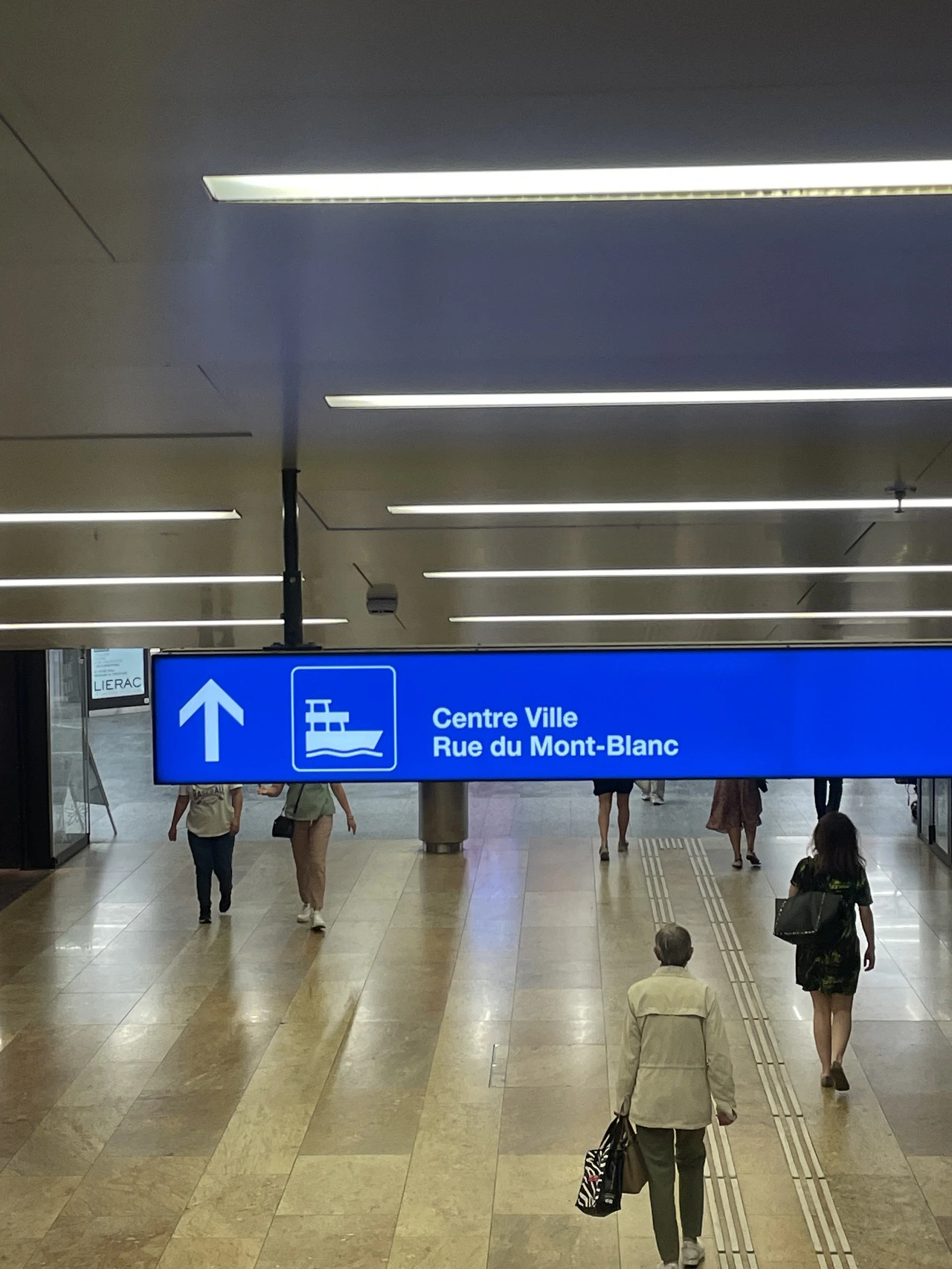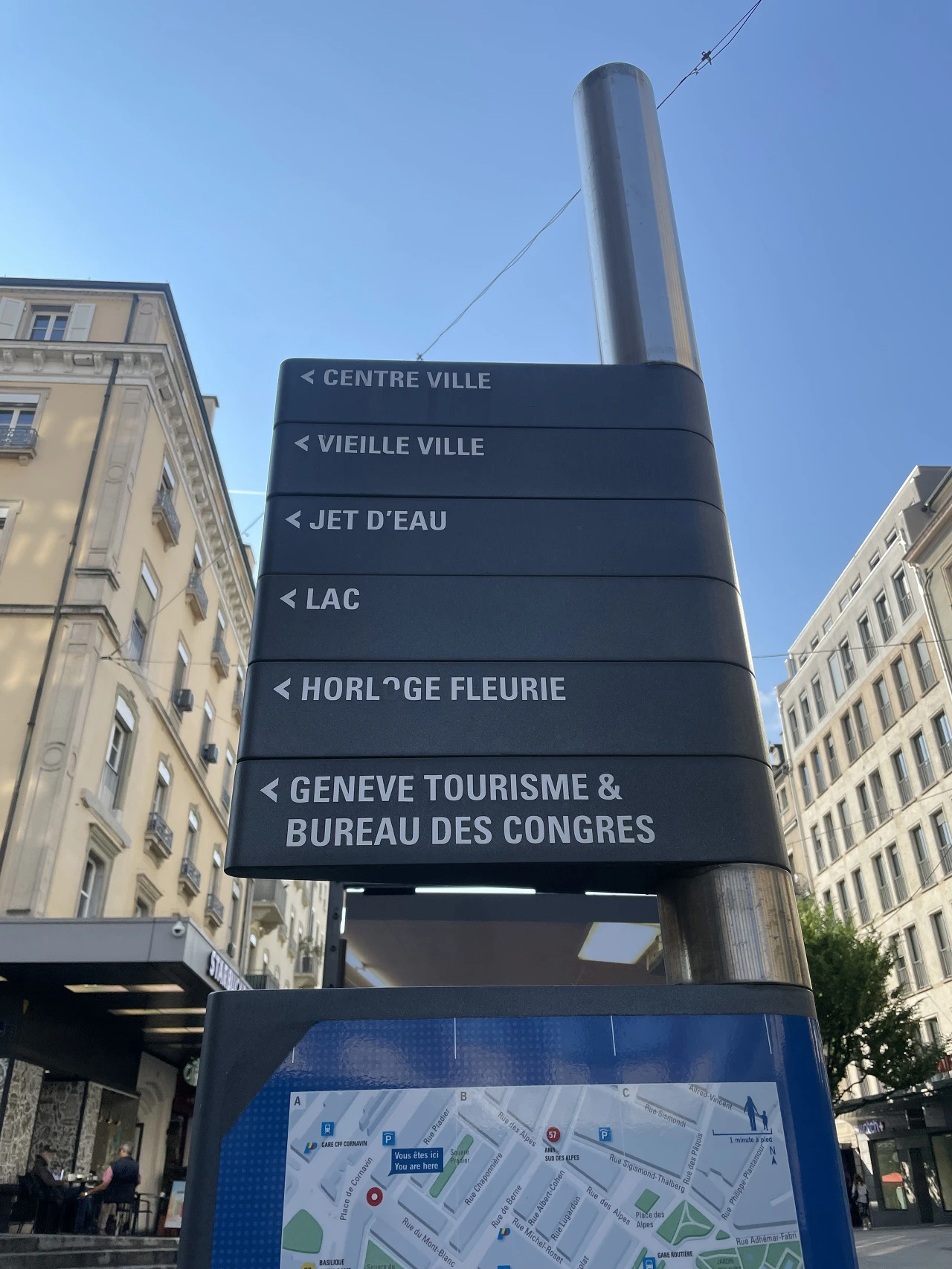 새로운 세상에 던져진 우린 어딜 가야 할지 정해야 했다. 오프라인에서 사용할 핸드폰 지도가 있었지만, 관광안내소에서 종이 지도를 받는 게 좋겠다고 판단했다. 발길이 닿는 대로 걷다 보니 기차역이 나왔다. 기차역은 깨끗하고 고급스러워 호텔 로비가 떠오를 정도였다. 이불만 깔고 자면 될 것 같은 이 쾌적한 공간에서 관광안내소를 찾을 수 없었다. 하지만 중요한 단서를 얻었는데, 그건 바로 시내 방향을 가리키는 화살표였다. 이 단서를 따라가니 도시 지도와 명소 곳곳을 가리키는 안내판을 발견했다. 하지만 지도와 방향 표시가 알려주는 구도심을 방향은 달랐다. 스위스 표지판에 익숙하지 않은 우리는 지도가 맞을 거라고 나름의 추론을 내리고 다시 걷기 시작했다. 결국 관광안내소는 찾지 못했고 한참 헤매다 호수를 건너 구도심으로 흘러 들어갔다. 호수 저편엔 140m의 분수가 높이 치솟아 있었다.